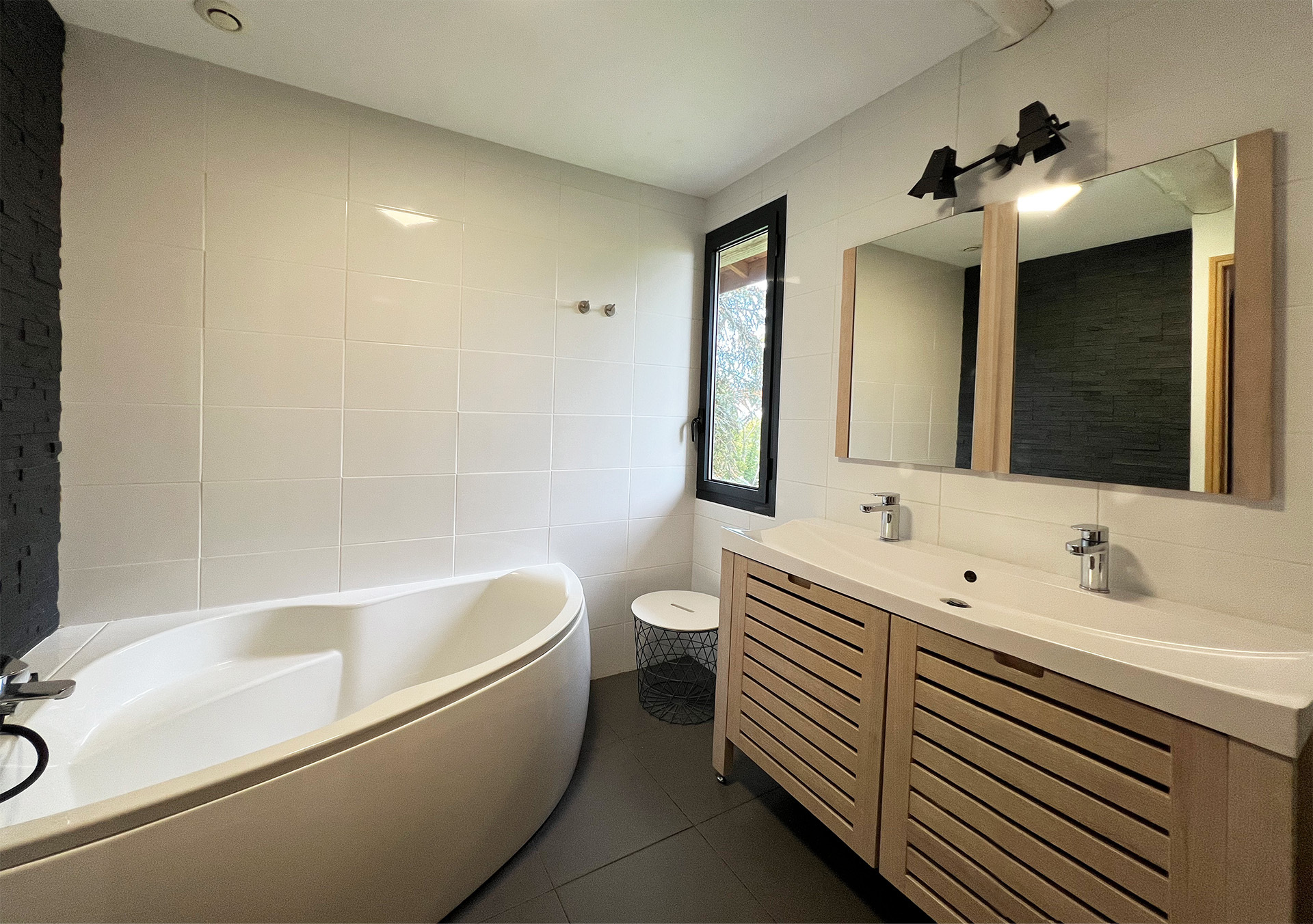 • Salle de bains familiale avec baignoire et double vasque,