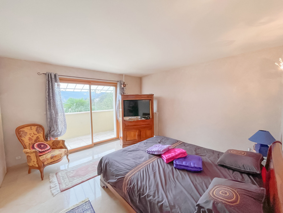 Cette demeure de charme offre une très grande et lumineuse pièce à vivre de 85m2 entièrement recouverte au sol par du marbre de Carrare, avec cuisine ouverte aménagée et équipée, un espace salon avec plafond cathédrale et cheminée, donnant accès via 5 baies vitrées à une grande terrasse de plus de 100m2 abritée et exposée plein sud, permettant de profiter de la quiétude du parc et de la vue sur la vallée de la Cance.