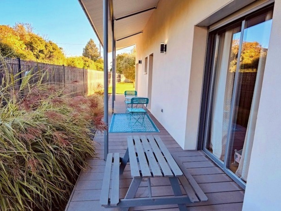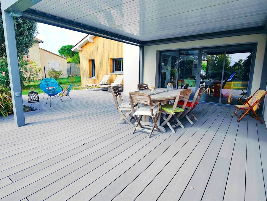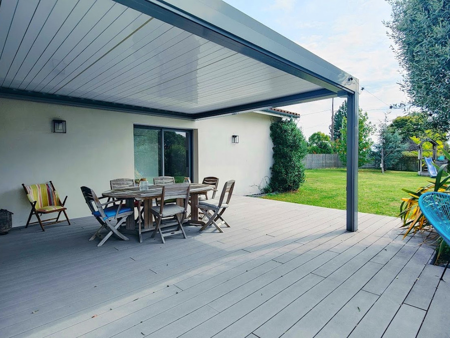 Terrasse spacieuse avec pergola bioclimatique : un véritable espace de vie extérieur, idéal pour les repas ou la détente