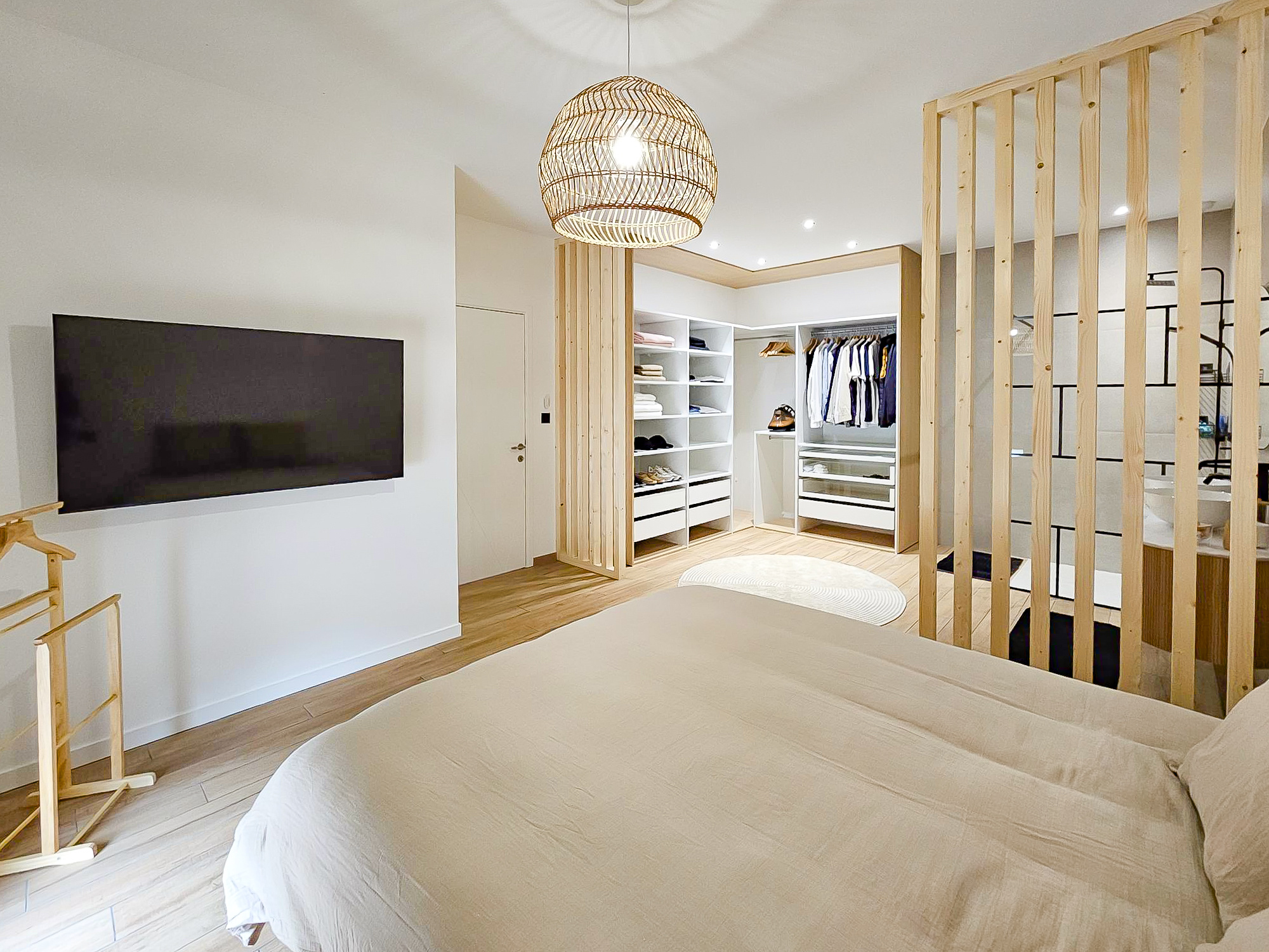 Elle offre une pièce à vivre de 55m2 pleine de charme avec cuisine américaine entièrement équipée, 2 grandes baies vitrées de 3 mètres apportent de la luminosité dans toute la pièce, s'ouvrant sur une terrasse de 50m2 en travertin et une belle hauteur de plafond à 2M70.