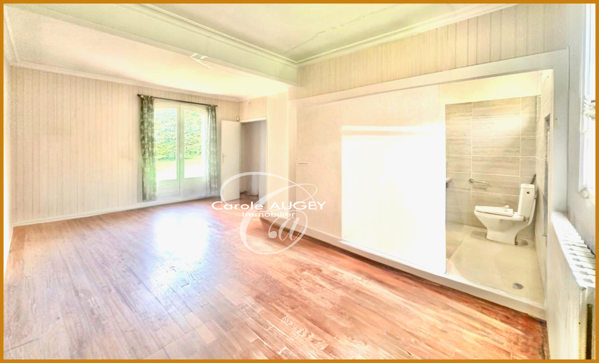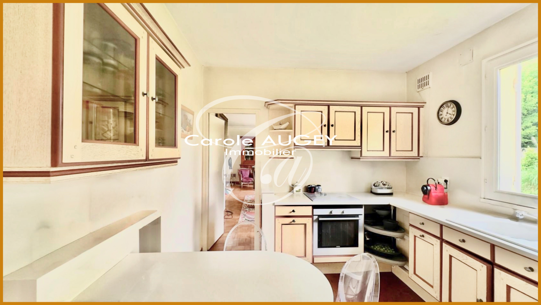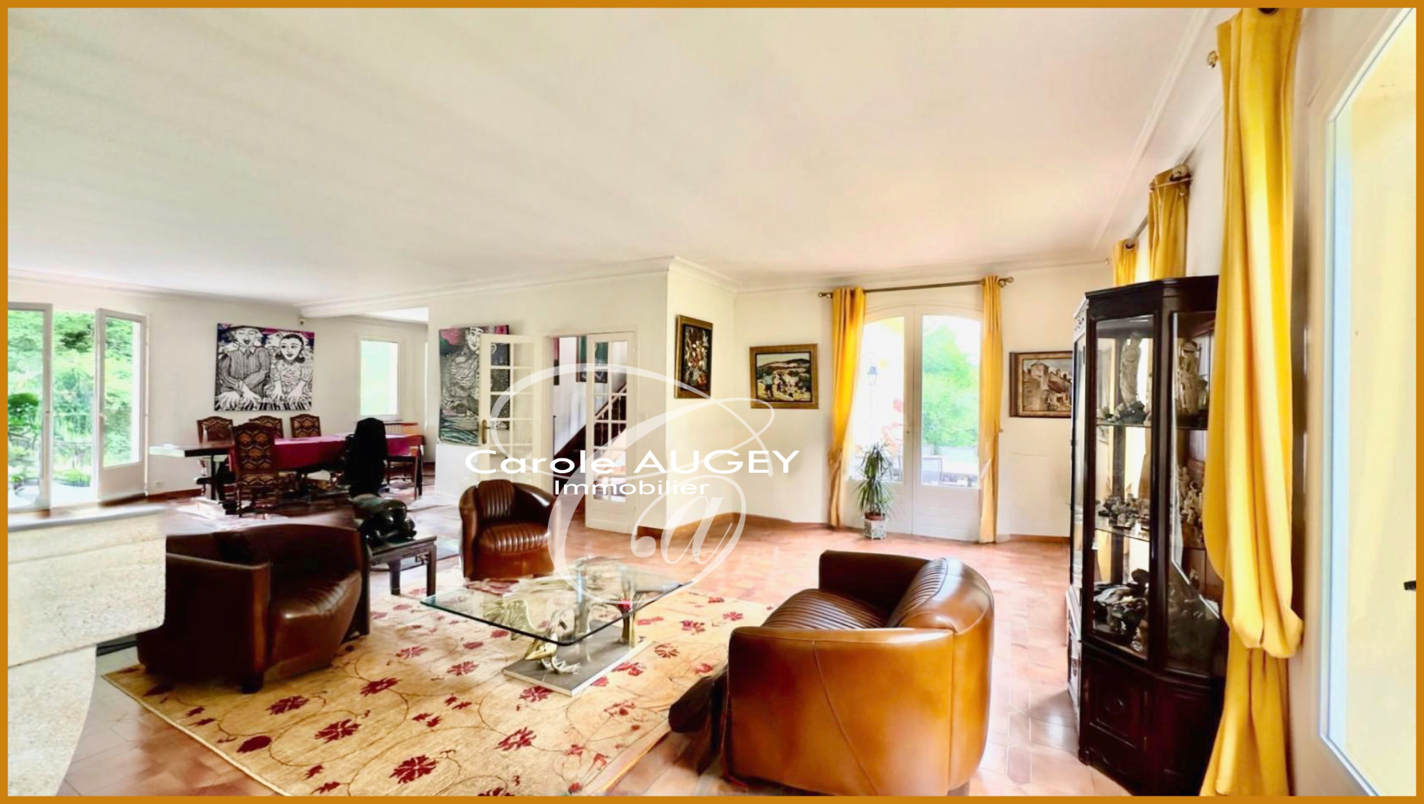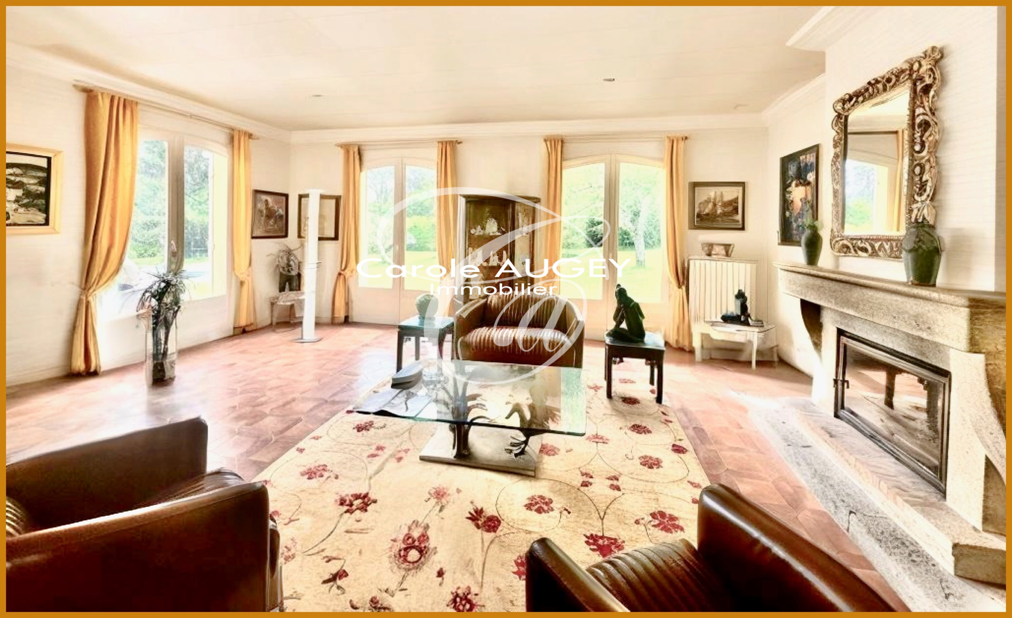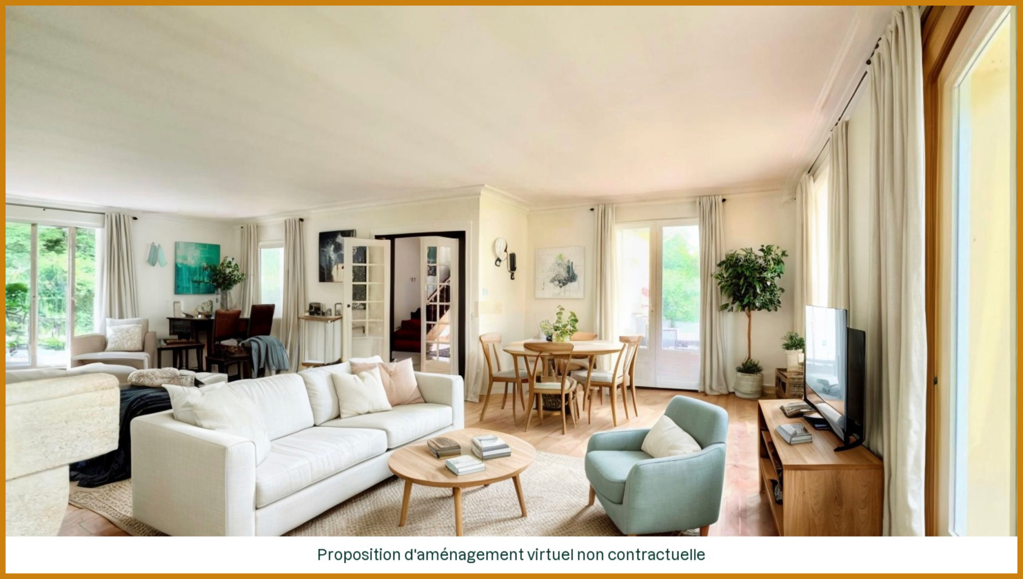Le salon en L de près de 65 m2 bénéficie d'une lumière traversante grâce à de larges baies vitrées orientées est et ouest. L'espace se prolonge vers une cuisine séparée, favorisant à la fois convivialité et indépendance. L'ambiance y est chaleureuse, portée par une cheminée avec insert et par un système de climatisation réversible intégré avec finesse.