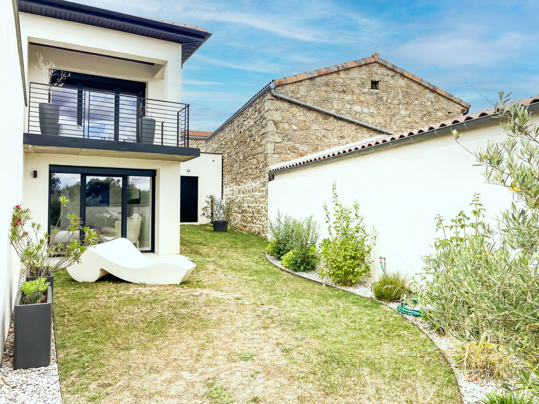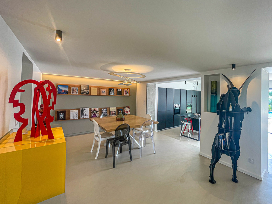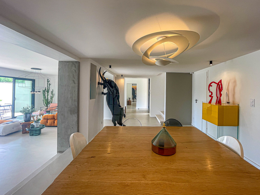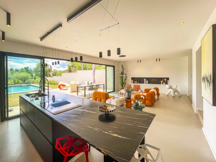 A DÉCOUVRIR SANS TARDER - A 30 MINUTES D'AMPUIS Dans un cadre bucolique, à deux pas du centre village au charme historique dans le nord de l'Ardèche - A moins d'une heure de LYON - 15 minutes de l'entrée d'autoroute et 15 minutes d'une gare - Superbe villa de 220m2 aux prestations haut de gamme, sur un terrain clos de 675m2 et paysagé avec arrosage automatique, piscine à électrolyse et garage de 50m2. Initialement construite dans les années 1970, cette superbe villa a été entièrement repensée et agrandie en 2023. L'entrée, très graphique, vous fait descendre une volée de marches suspendues, en béton, jusqu'à une immense pièce à vivre baignée de lumière par une baie de 7m de large donnant à contempler la piscine et la campagne environnante. La cuisine américaine, entièrement équipée, dispose d'un plan de travail et d'un évier taillé dans un marbre sombre au veinage très contrasté, mis en valeur par la luminosité de la pièce. Le RDC dispose d'un premier espace nuit composé d'une suite parentale avec dressing et salle d'eau privative, d'un cellier/buanderie, et d'un bureau pouvant faire office de chambre supplémentaire. L'étage propose un second espace nuit composé de 3 belles chambres toutes avec dressing, une seconde salle d'eau avec WC séparé, et un pallier central faisant office de salon / salle de jeu, donnant sur un balcon. Prestations modernes et haut de gamme, avec chauffage au sol par pompe à chaleur air/eau réversible - Menuiseries en aluminium double vitrage avec moustiquaires et volets roulants électriques - Portail et porte de garage automatiques...