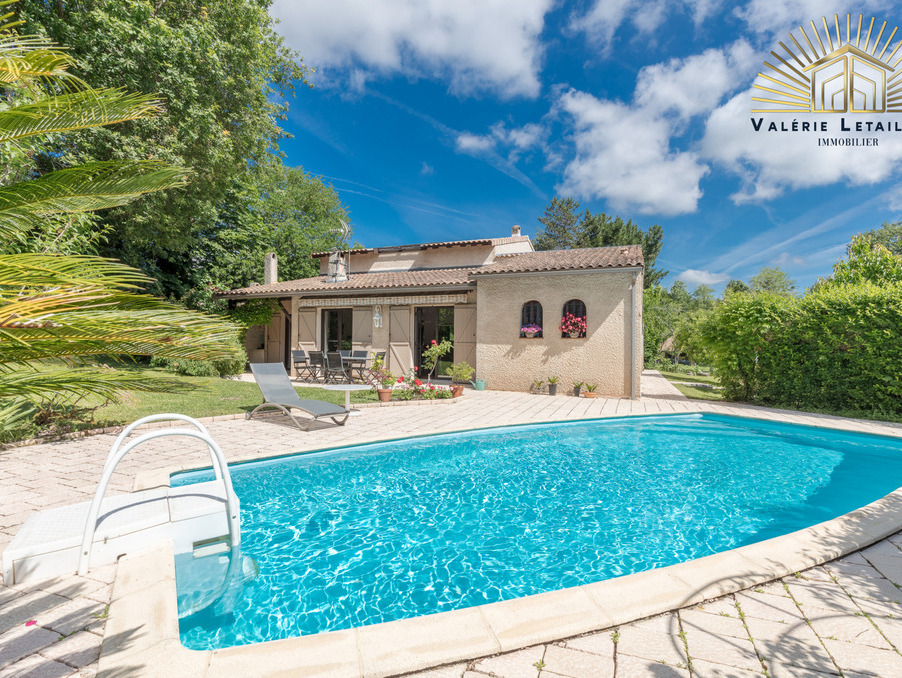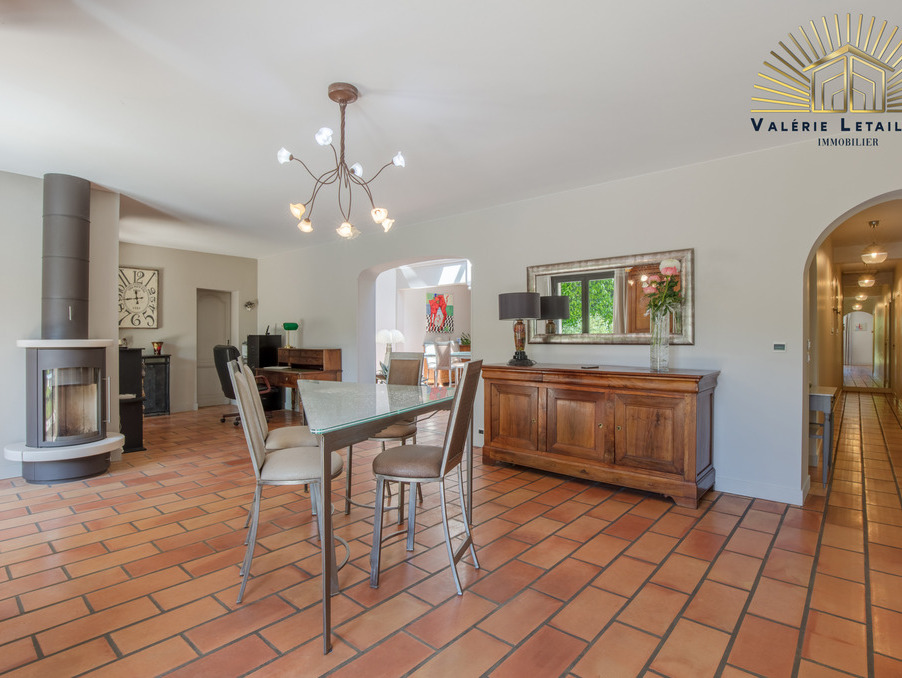 Un petit coin bureau complète l'espace de vie. Puis, une cuisine séparée par une verrière et son cellier attenant viennent parfaire le tout. Depuis la salle à manger, l'accès à une belle terrasse avec piscine crée un lien fluide entre l'intérieur et le jardin, dans un petit cocon de verdure.