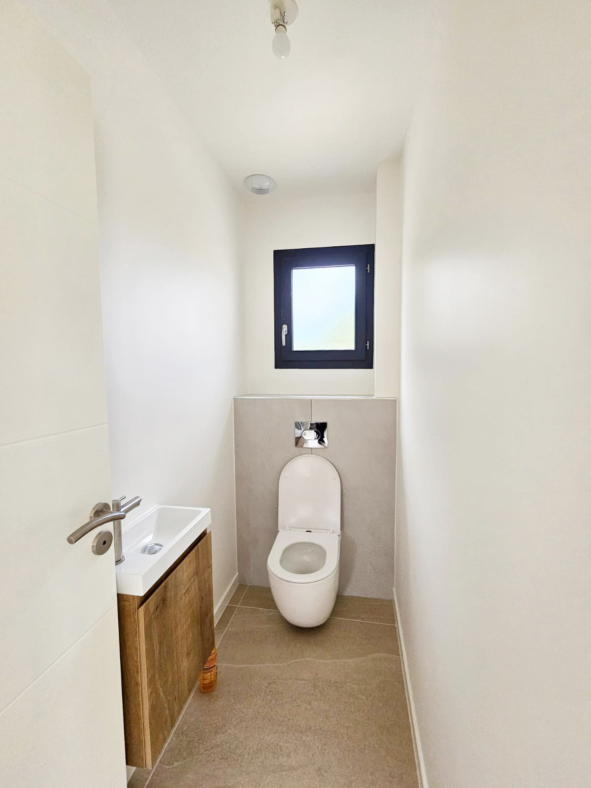 Maison contemporaine de 136m2 dont garage de 28m2 sur un terrain de 260m2 située en plein centre du village à pieds de toutes les commodités.