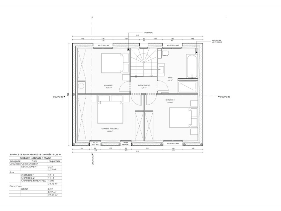 A l'étage : un pallier desservant trois chambres de 11 m2, 12 m2 et 15 m2et une salle de bain de 9 m2 spacieuse, prévue pour accueillir des prestations de qualité : douche à l'italienne, baignoire, meuble double vasque et WC.