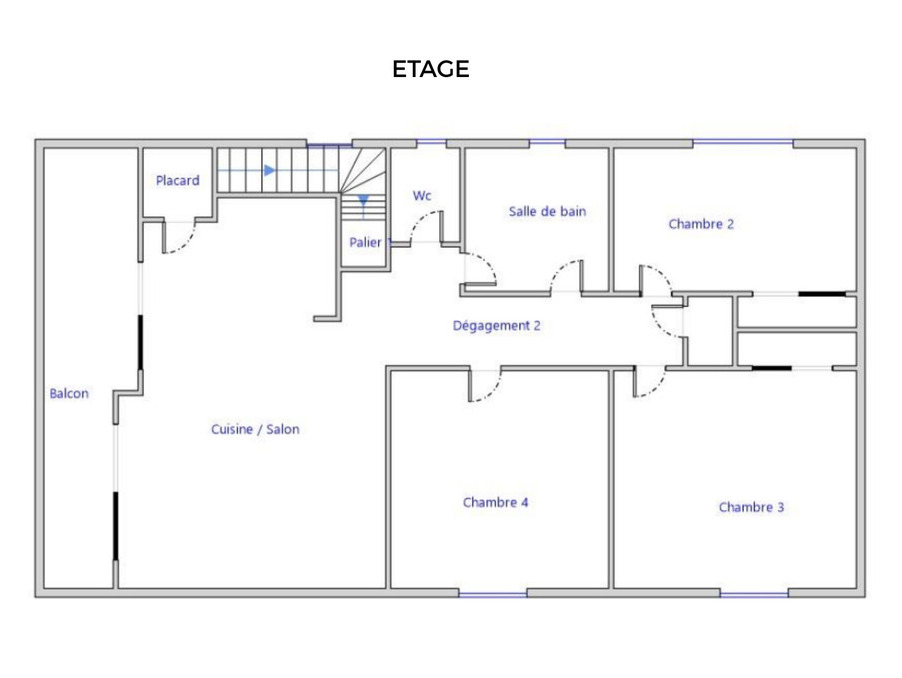 A l'étage, séjour avec cuisine ouverte (à aménager) et accès terrasse, salle de bains, WC et 3 grandes chambres (de 12 à 16m2).