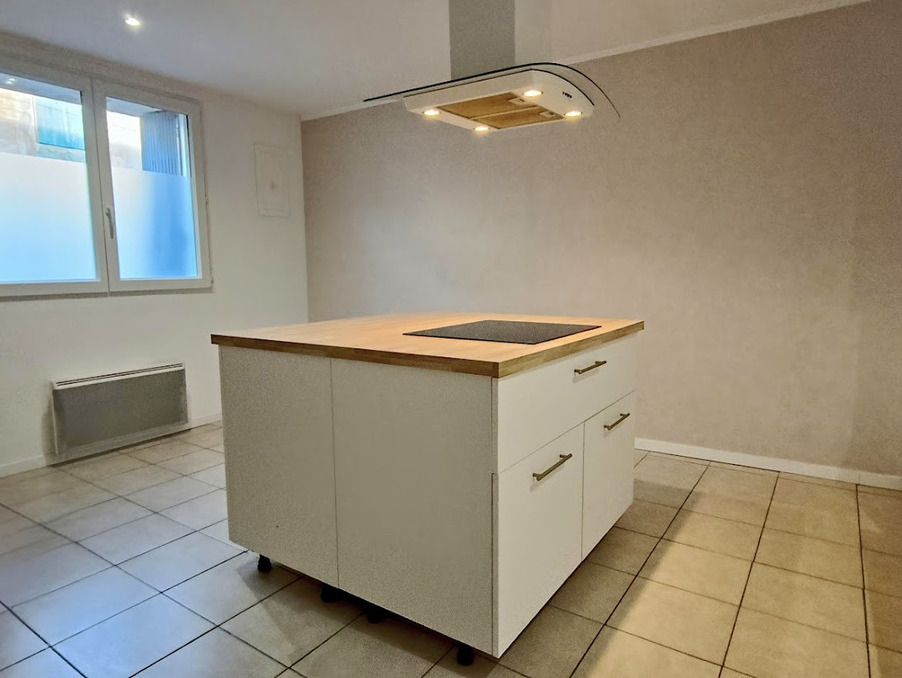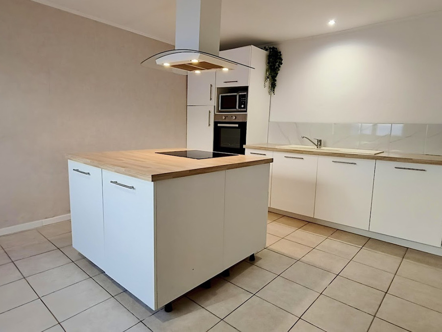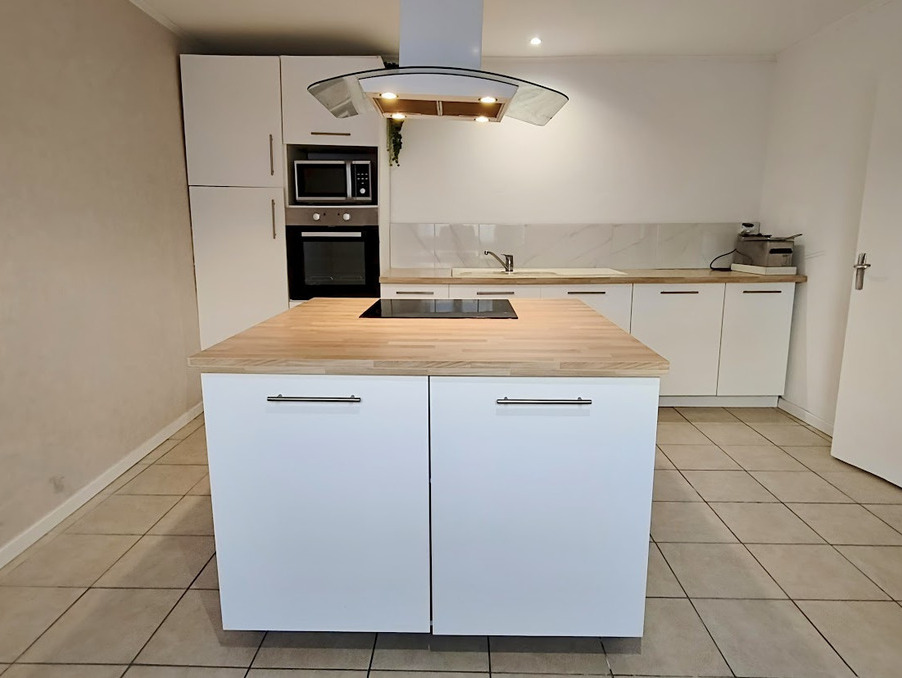Une entrée ouvrant sur une cuisine moderne aménagée et équipée (plaque, four, plan de travail central, nombreux rangements).