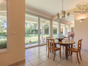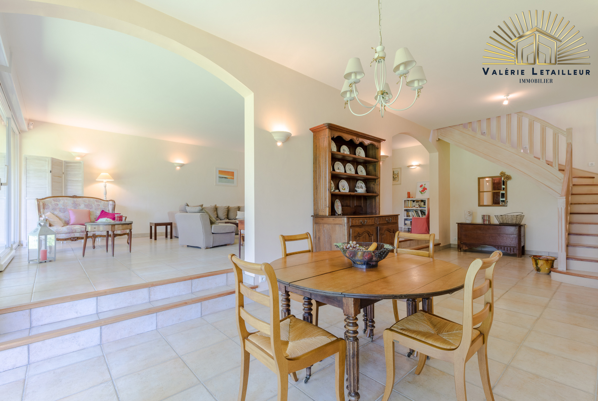 Avançons. Nous apprécierons les deux espaces séparés par deux marches apportant beaucoup de modernité à la pièce. Nous débuterons par la salle à manger et nous avancerons ensuite vers le salon qui propose une belle cheminée centrale. La pièce offre beaucoup de lumière grâce au mur de baies vitrées ouvrant sur l'extérieur.