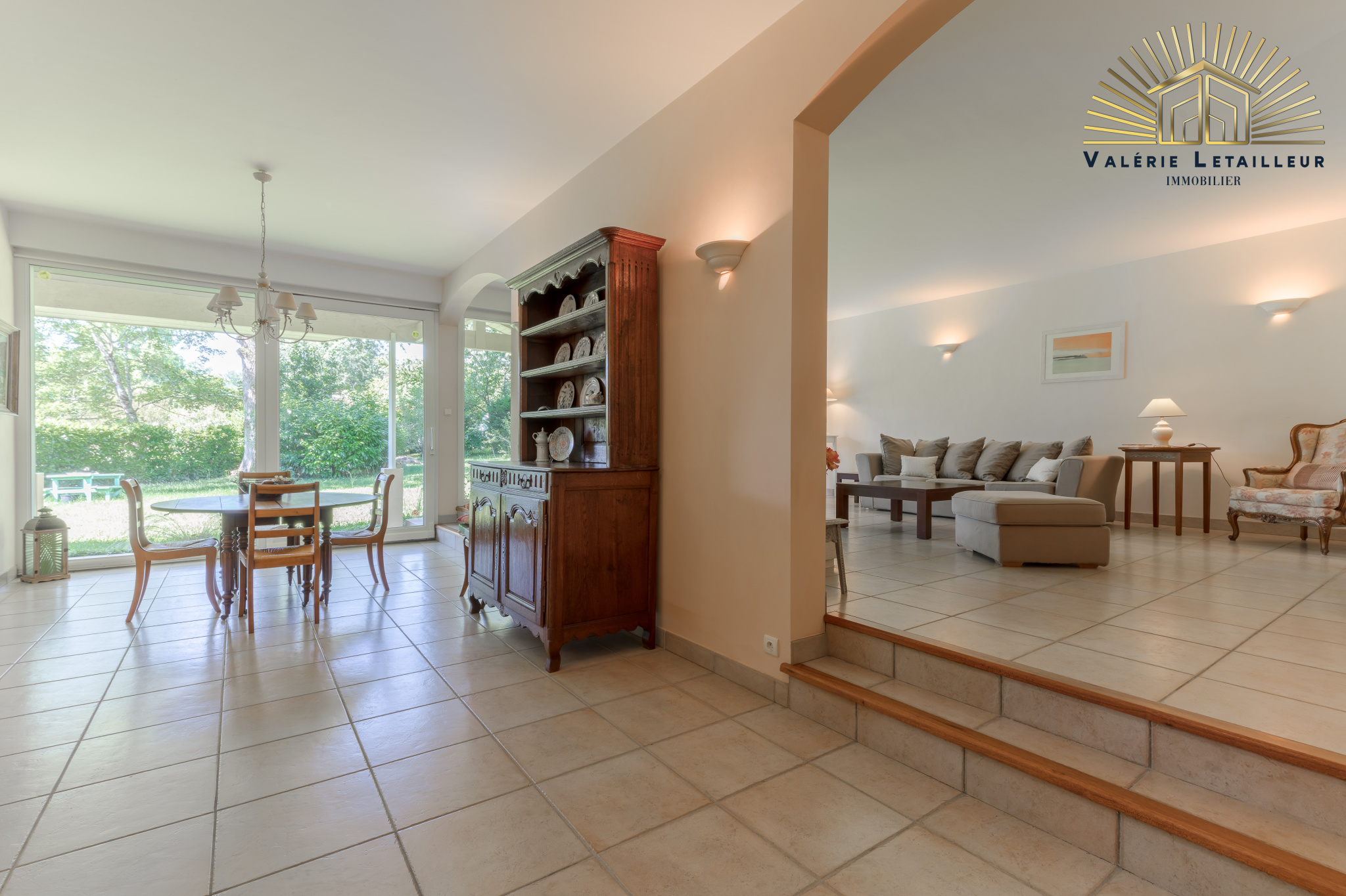 Nous serons accueillis dans un bel espace permettant de vous libérer de votre vestiaire puis votre regard sera happé par cette grande pièce qui s'offre à vous avec vue sur le jardin.