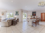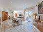 Entrons maintenant. Nous serons accueillis dans une vaste pièce qui comprend un espace d'entrée, un salon chaleureux autour de la cheminée, et un coin salle à manger. Ce volume spacieux bénéficie de nombreuses baies vitrées, baignant les lieux de lumière naturelle et offrant une vue dégagée sur le jardin.