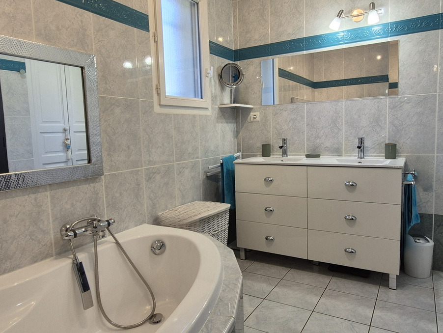 Au demi-niveau : vous découvrirez une salle de bain de plus de 7 m2, équipée d'une baignoire, d'une douche, d'une double vasque et d'un cabinet de toilette, ainsi que trois belles chambres avec placards de 10.50 à 14 m2 et une 4 ème chambre mansardée et climatisée d'appoint sous les combles.