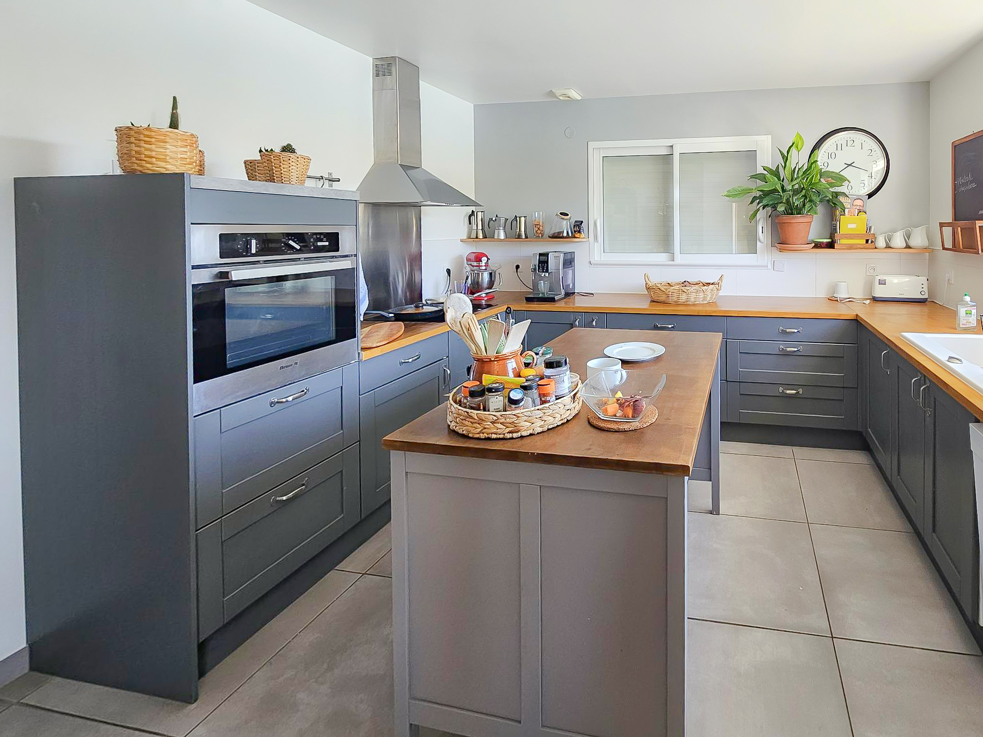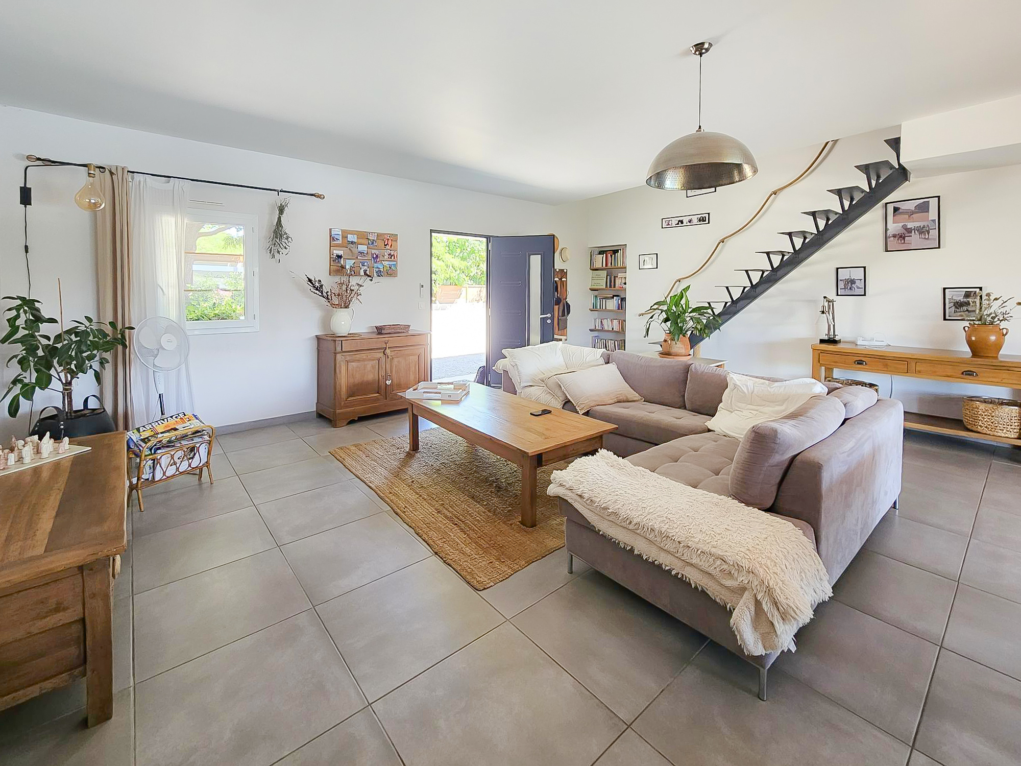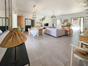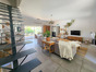 Une pièce à vivre avec beaucoup de cachet lumineuse et agréable à vivre, traversante avec des ouvertures de chaque côté et une baie vitrée s'ouvrant sur une jolie terrasse avec vue sur la piscine, une cuisine semi ouverte entièrement équipée tout en respectant le style de la maison.