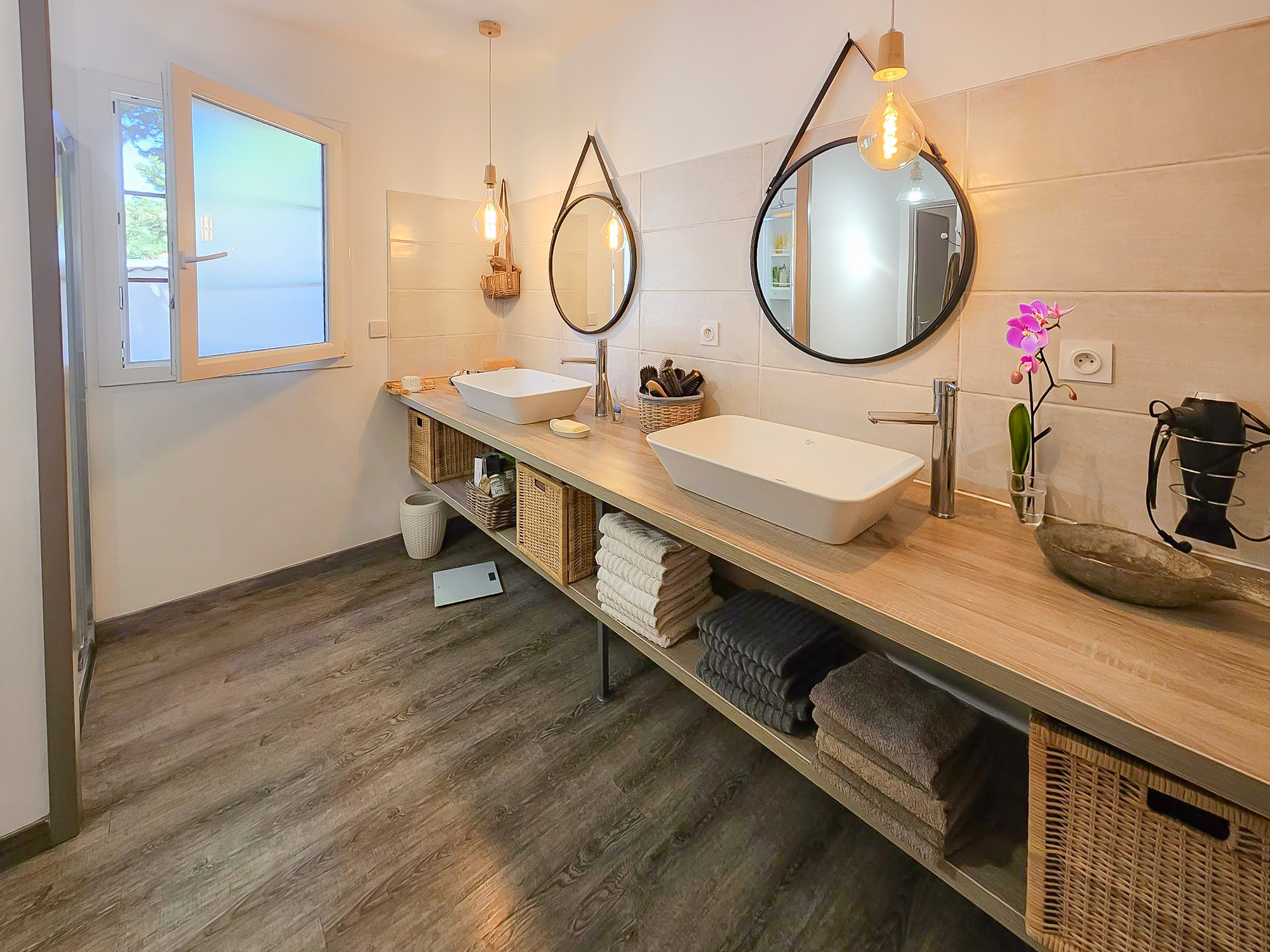 Elle offre 3 chambres dont une suite parentale au rez de chaussée de 20m2 avec salle d'eau, toilettes et 2 chambres à l'étage de 14m2 avec salle d'eau et toilettes.
