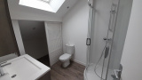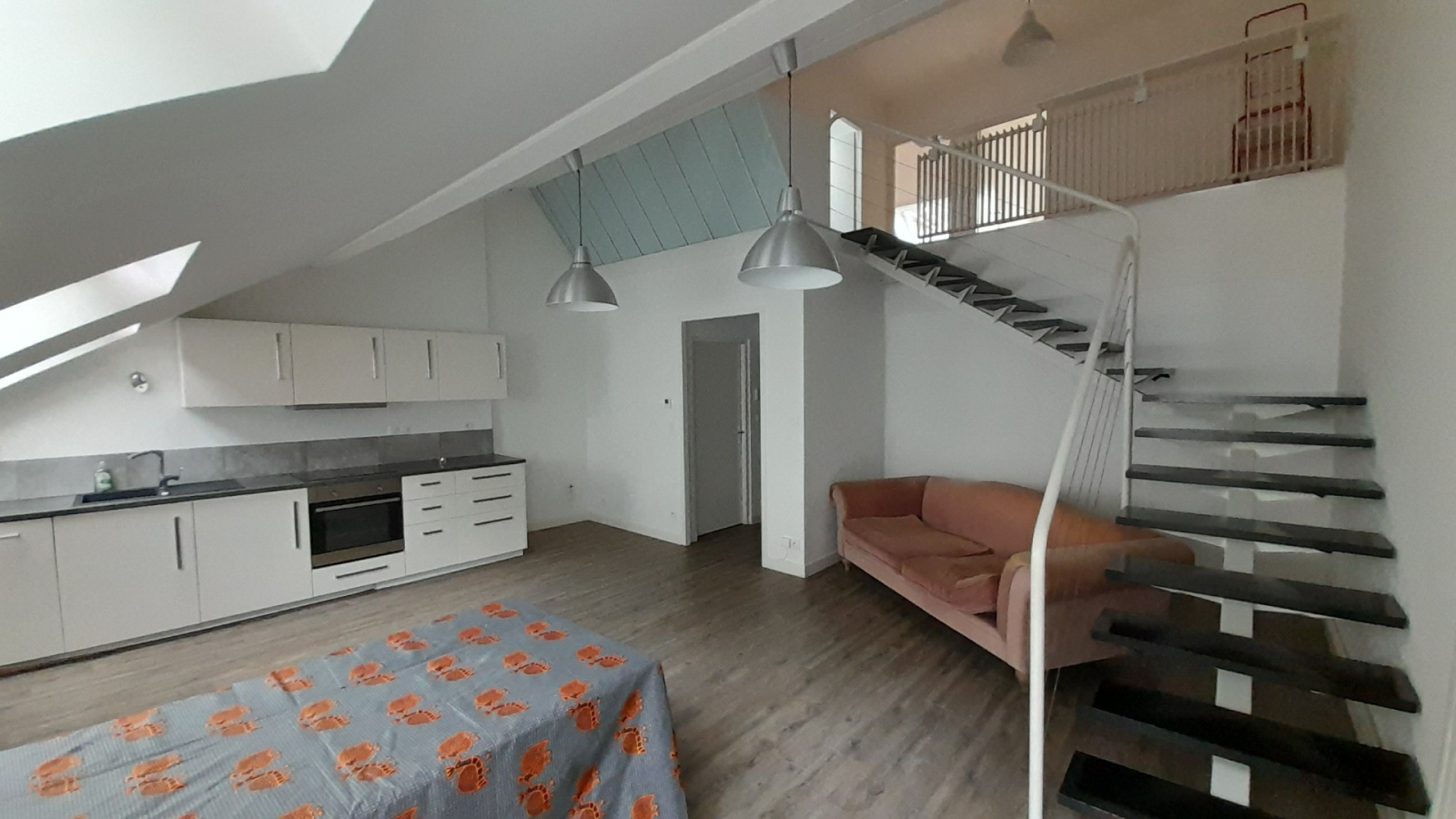À l’étage, le duplex se compose d’une mezzanine, de deux chambres, dont une avec placard intégré, ainsi que d’une salle de douche meublée avec WC.