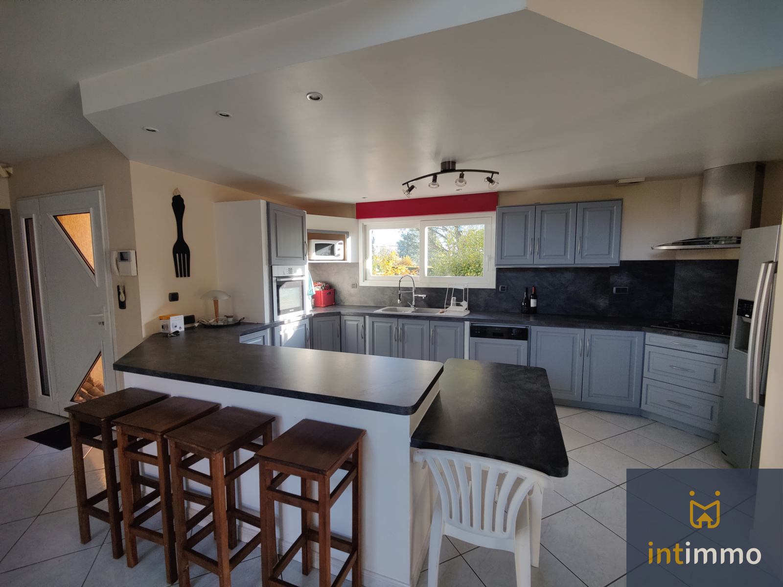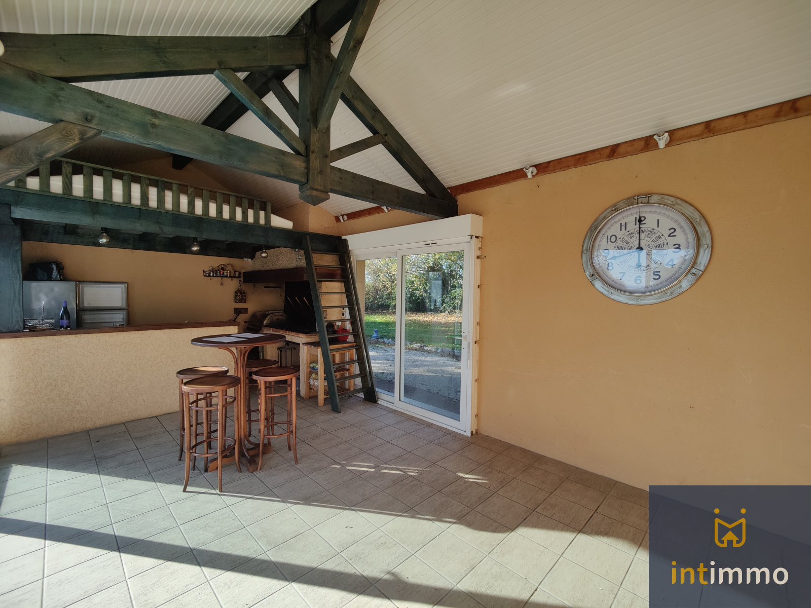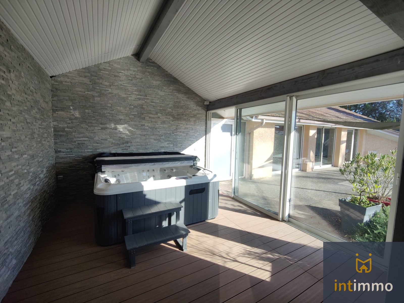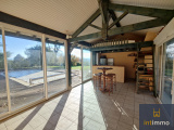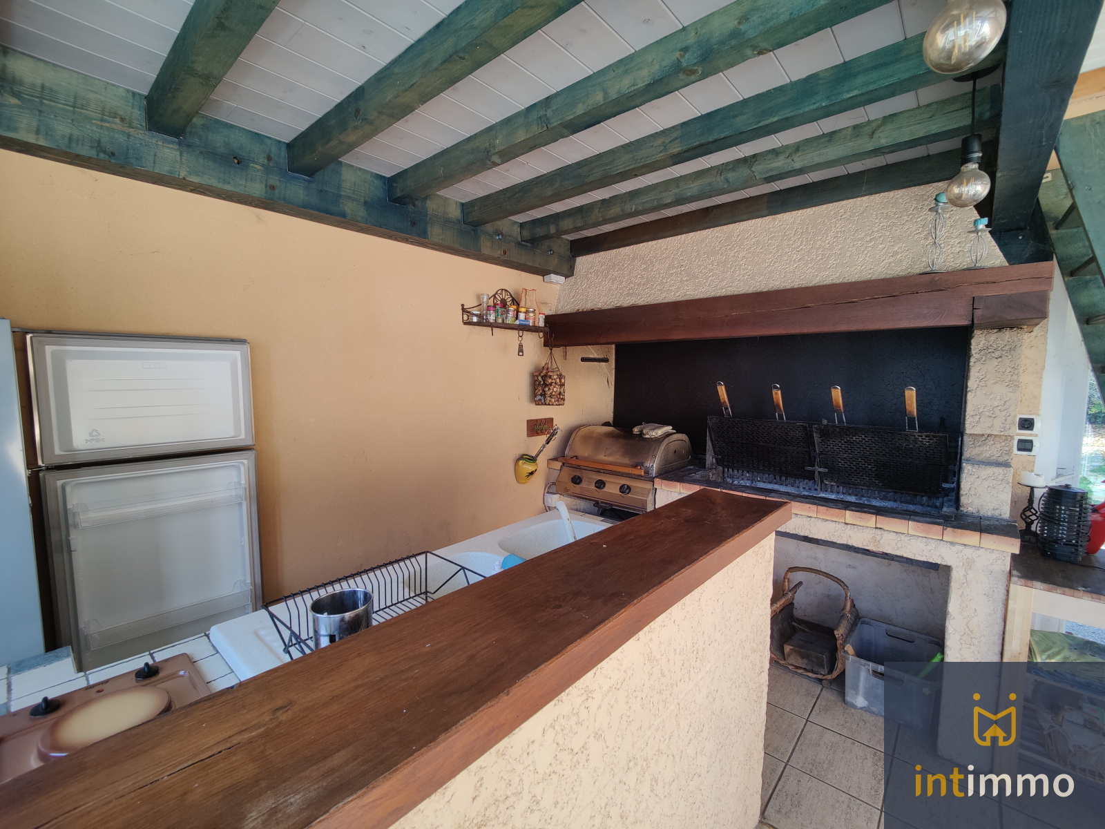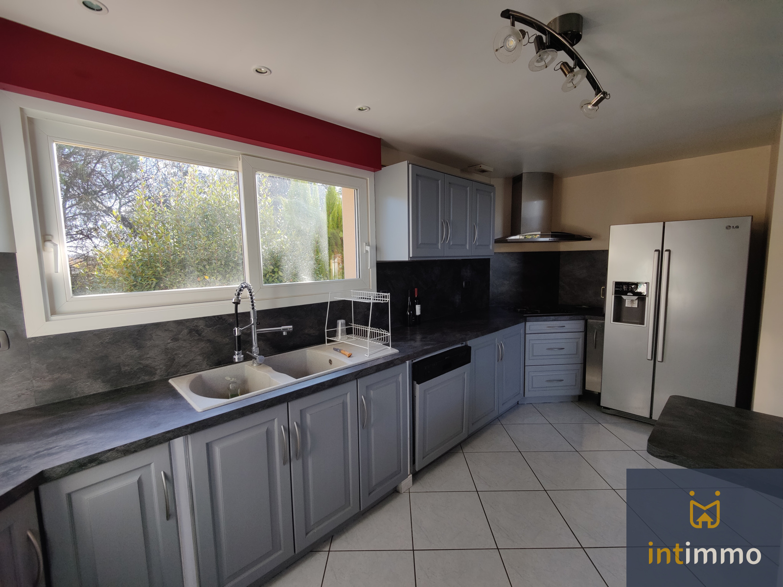 Entrée, cuisine ouverte aménagée et équipée (four, plaques gaz, lave-vaisselle, frigo, micro-ondes, meubles hauts et bas), grand salon lumineux donnant sur le jardin, la piscine et la véranda fermée qui sert aujourd’hui de salle à manger.