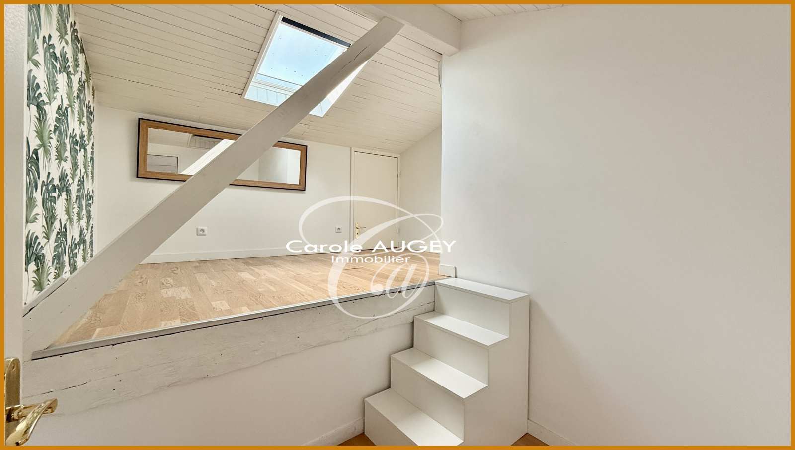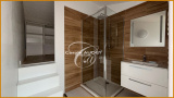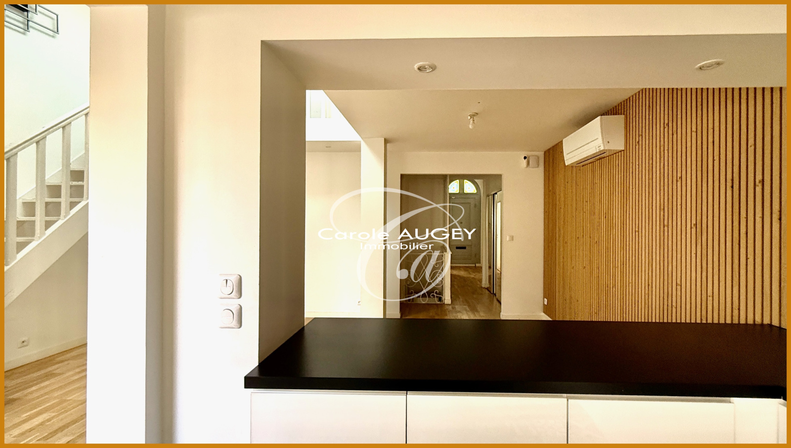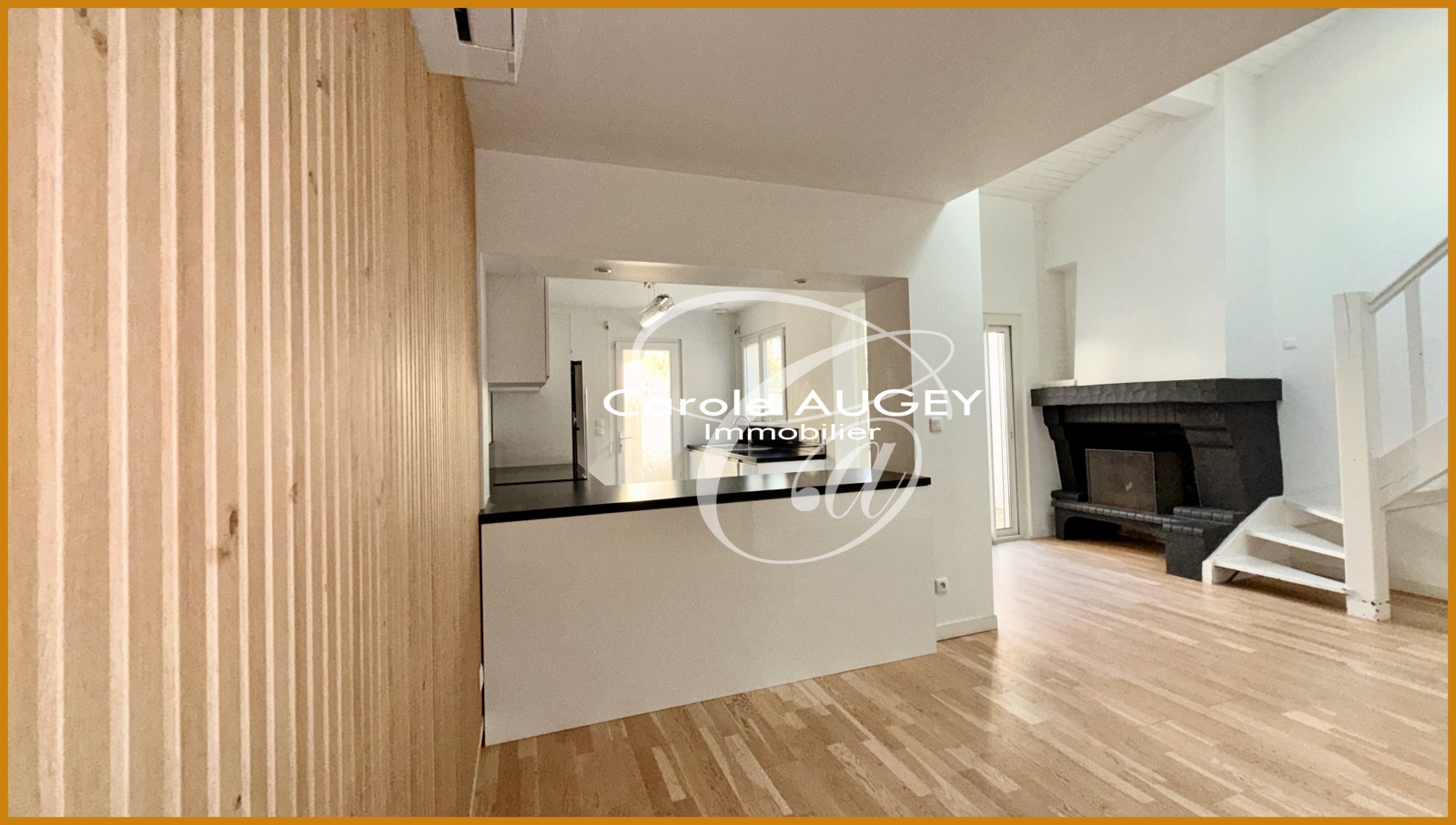 Une fois la porte franchie, vous êtes accueilli par une ambiance chaleureuse où le bois domine avec élégance. Le parquet au sol se marie parfaitement aux murs blancs, et un superbe mur en lamelles de bois ajoute une touche design qui donne le ton. La pièce de vie s’articule autour d’une cuisine américaine entièrement équipée, ouverte sur l’espace salon, pour une circulation fluide et conviviale.