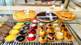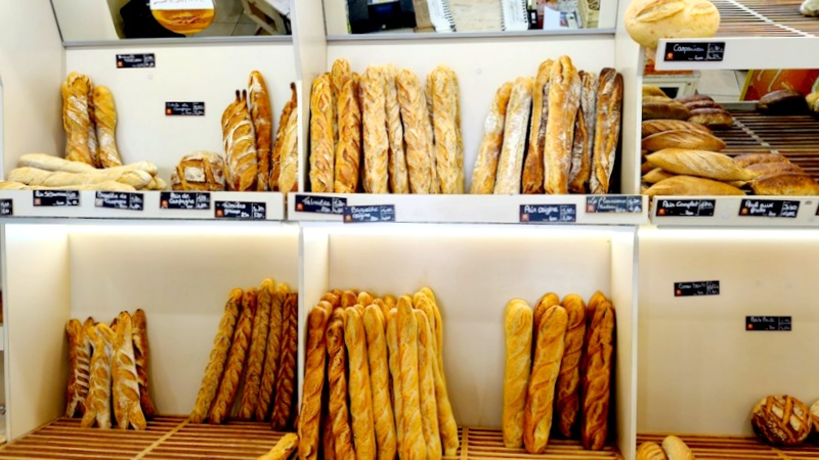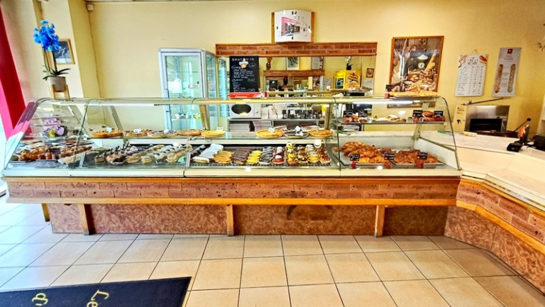 Boutique chaleureuse avec vitrines pour pains, viennoiseries et pâtisseries.