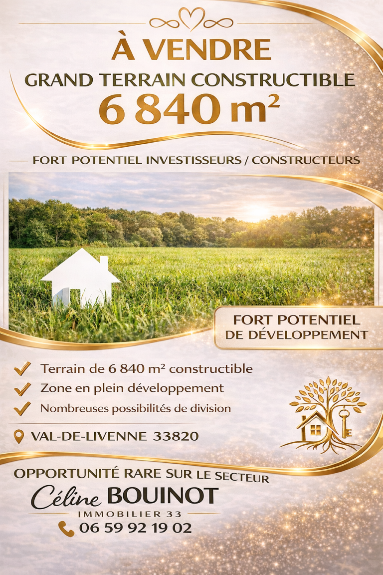 À vendre sur la commune de Saint-Caprais-de-Blaye, terrain constructible d’une surface totale de 6 840 m², offrant un fort potentiel de développement.