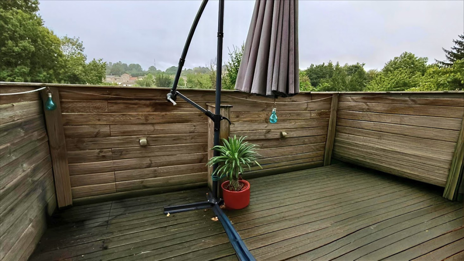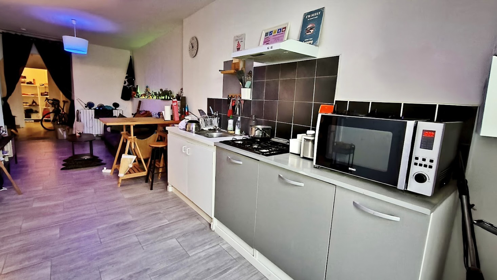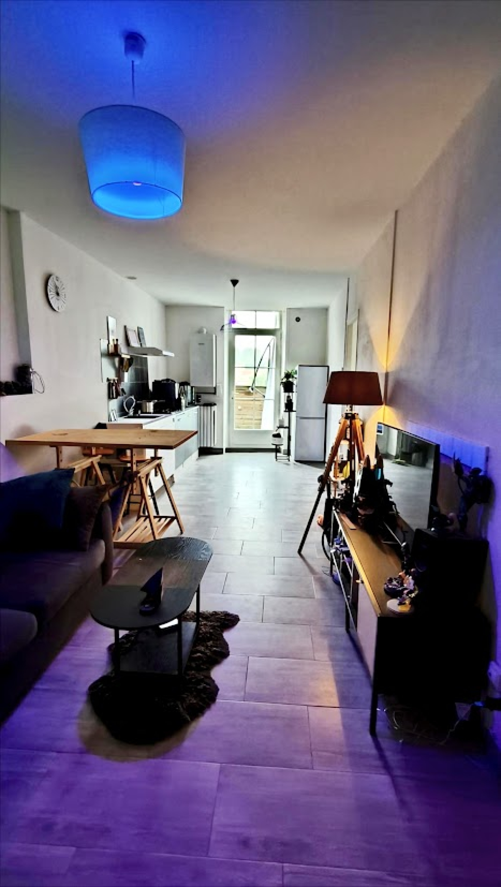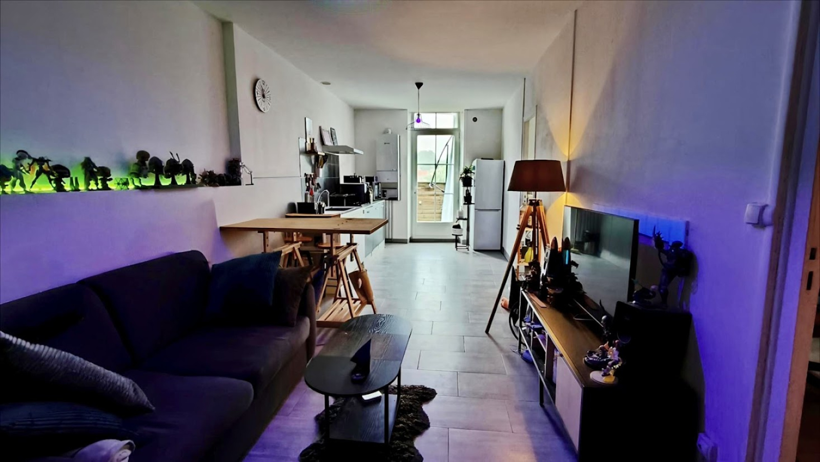 une spacieuse pièce de vie regroupant salon, salle à manger et cuisine ouverte, donnant accès à un grand balcon avec vue sur le jardin et la piste cyclable qui mène au centre-ville à pied.