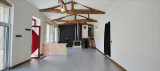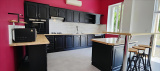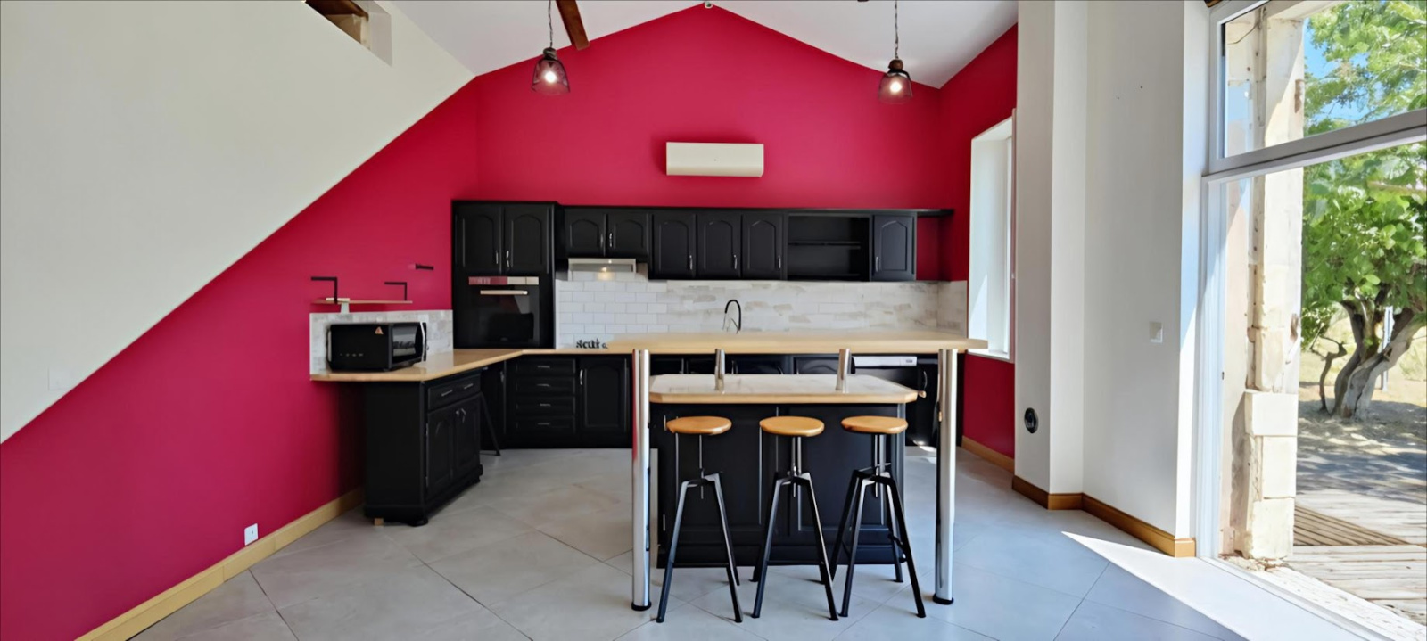 Une grande pièce de vie lumineuse avec cuisine ouverte sur le salon et la salle à manger,