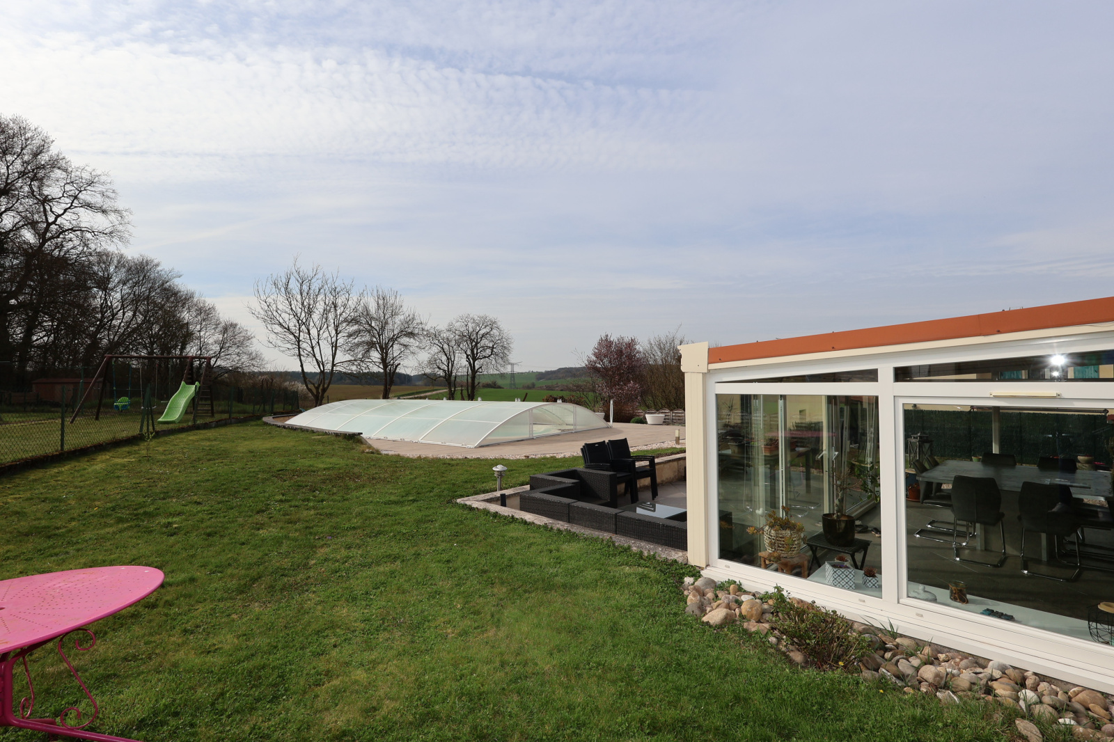 A 10 mn de Metz, Au 68 B rue Froide à Hayes, Didier HOFFMAN, agent mandataire Provimo vous propose cette grande maison en demi-niveaux construite en 1999 sur un beau terrain clos et arboré de près de 15 ares, agrémenté d'une belle piscine extérieure chauffée couverte par son dôme. Composée d'un grand salon-séjour avec une cuisine équipée, ouverte sur une véranda chauffée de 26 m² et sur le jardin sans vis à vis. Le demi niveau supérieur accueille la partie nuit composéé de 4 chambres, et d'une salle de bains. Sur le demi niveau inférieur le garage doté de deux portes sectionelles motorisées peut recevoir 2 voitures, mais également moto et vélos. Sur le même niveau sont accessibles la buanderie et la chaufferie. La pompe à chaleur vient d'être installée en 2025 et rend cette maison particulièrement économique. La faible taxe foncière et la présence de la fibre optique rendent cette maison particulièrement attrayante. La porte d'entrée en aluminium avec ouverture par reconnaissance d'empreinte digitiale ainsi que les fenêtres et les volets roulants en PVC sont récents.