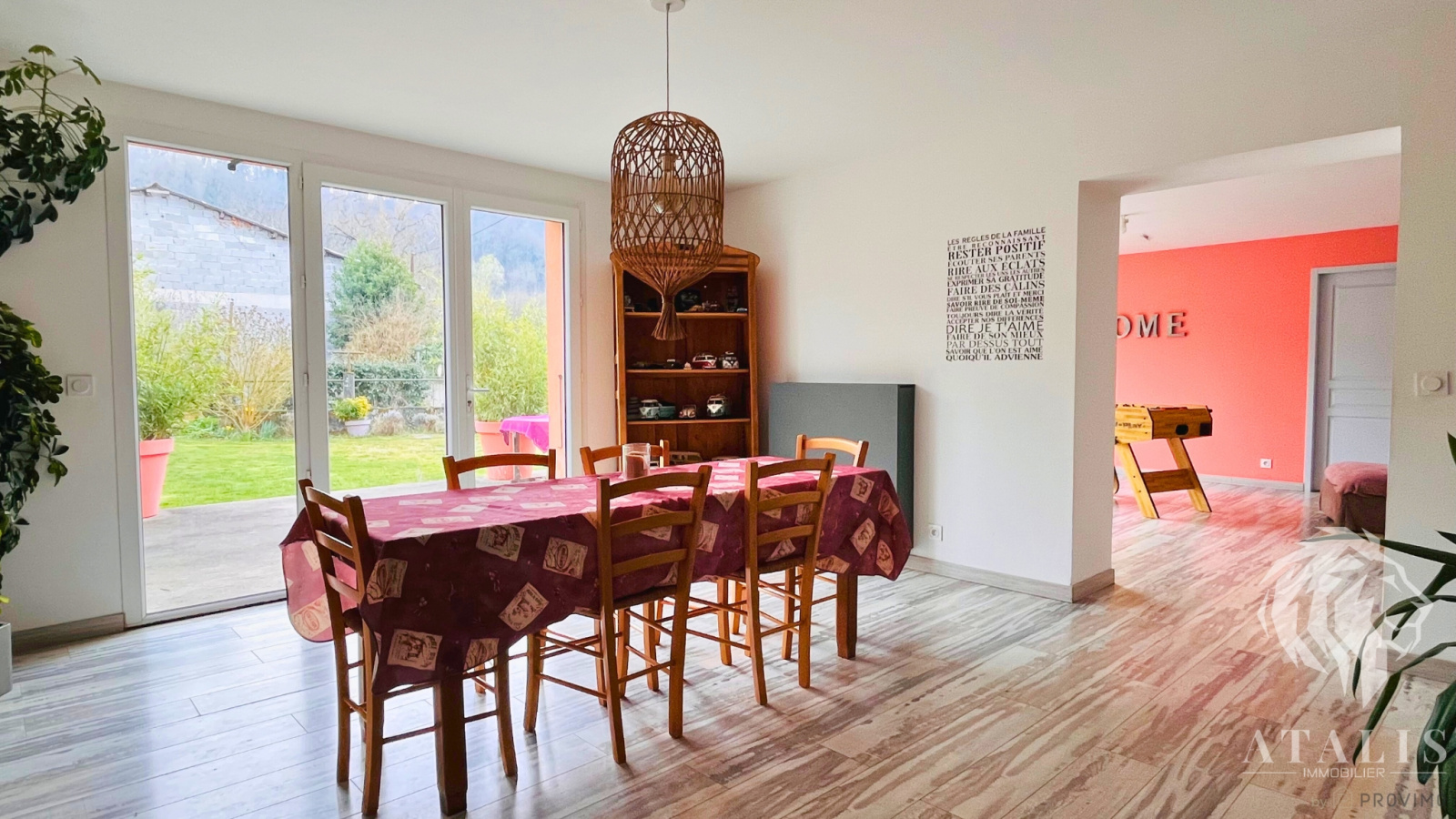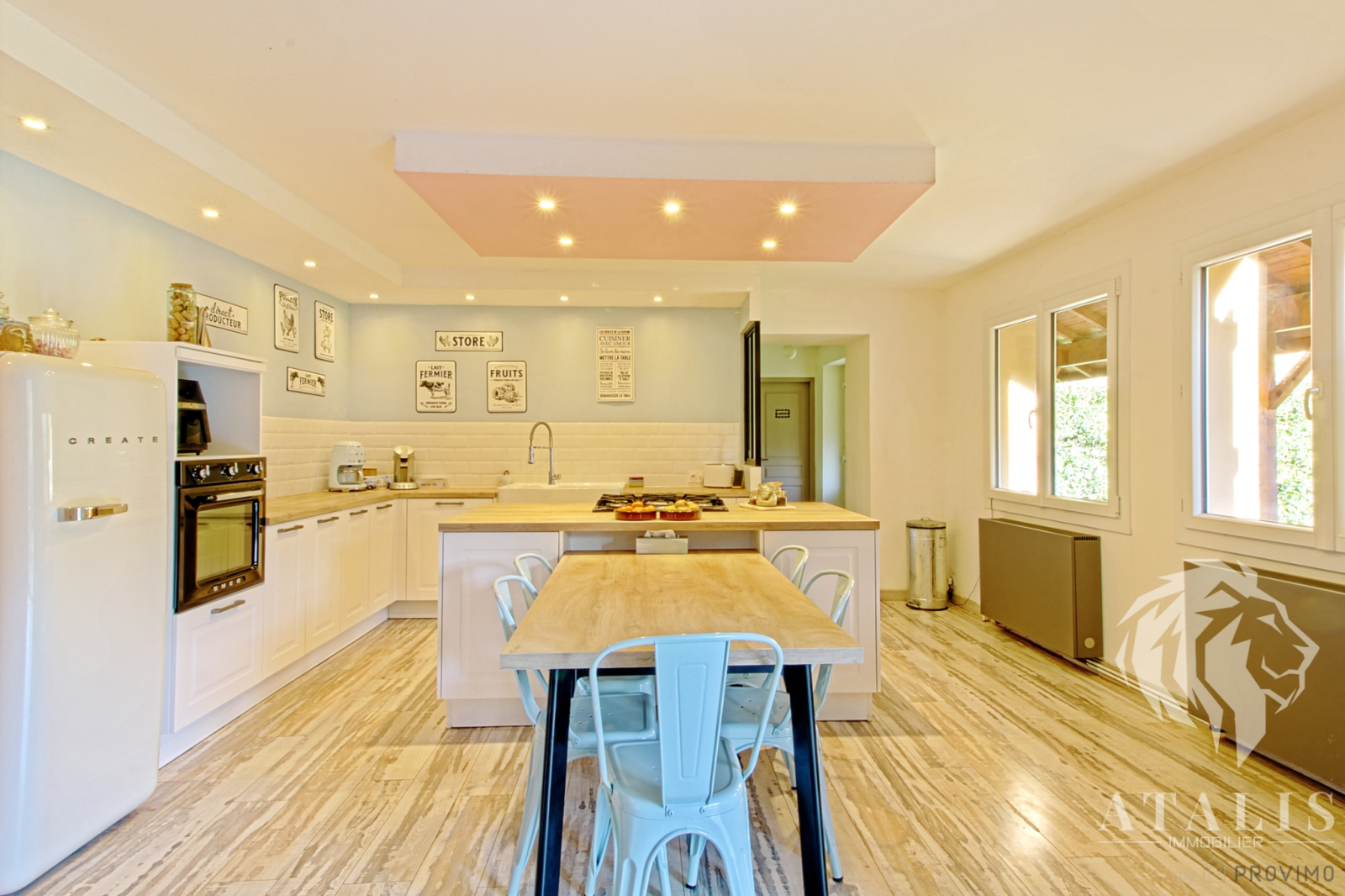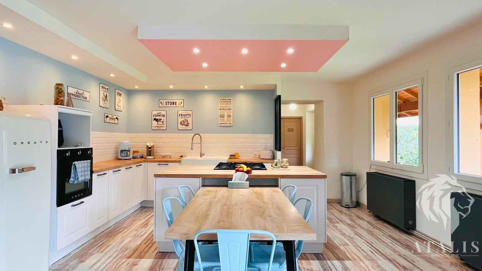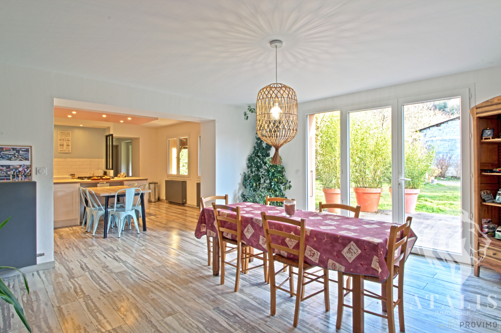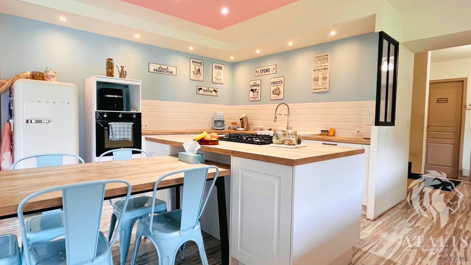 Située au fond d'une impasse, au calme et proche du centre village, cette maison en grande partie rénovée offre la confortable superficie de 171 m² avec de très grandes pièces de vie (77 m² de séjour / cuisine !), 4 chambres, une grande salle de bains (baignoire + douche) et un WC indépendant.