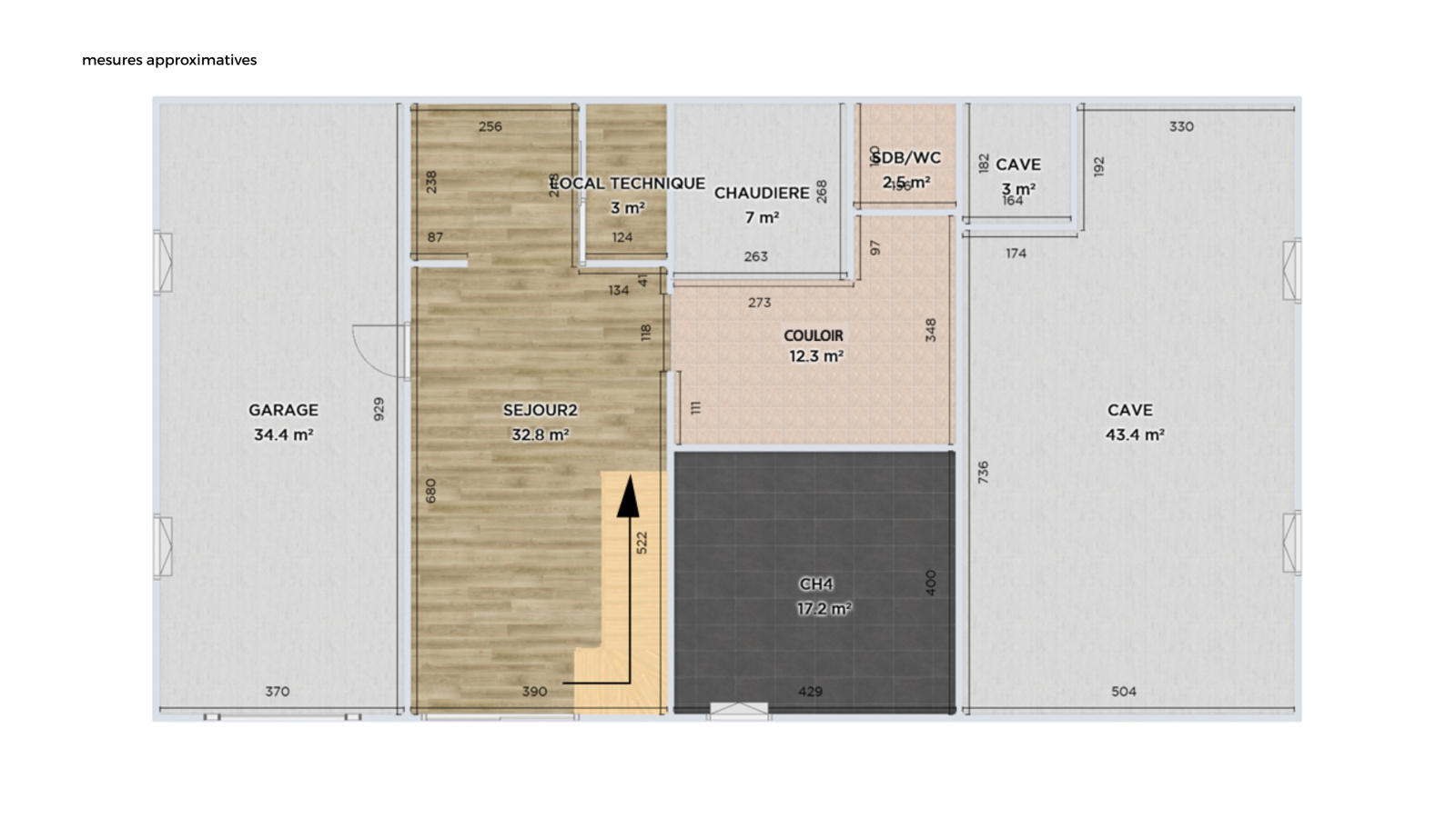 Le demi sous-sol comprend un garage de 34 m², une grande cave de 43 m², un séjour/pièce de vie supplémentaire de 33 m², une quatrième chambre de 17 m², une salle d'eau avec WC, un local technique et une chaufferie.