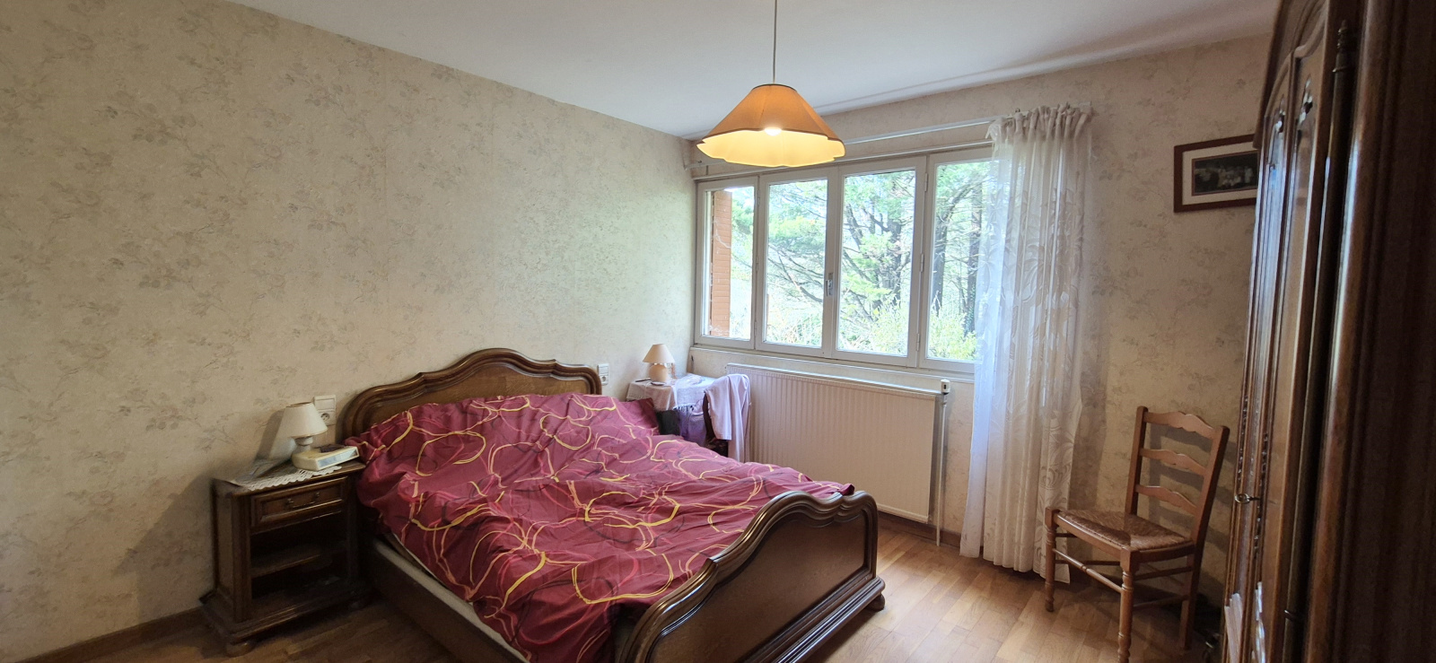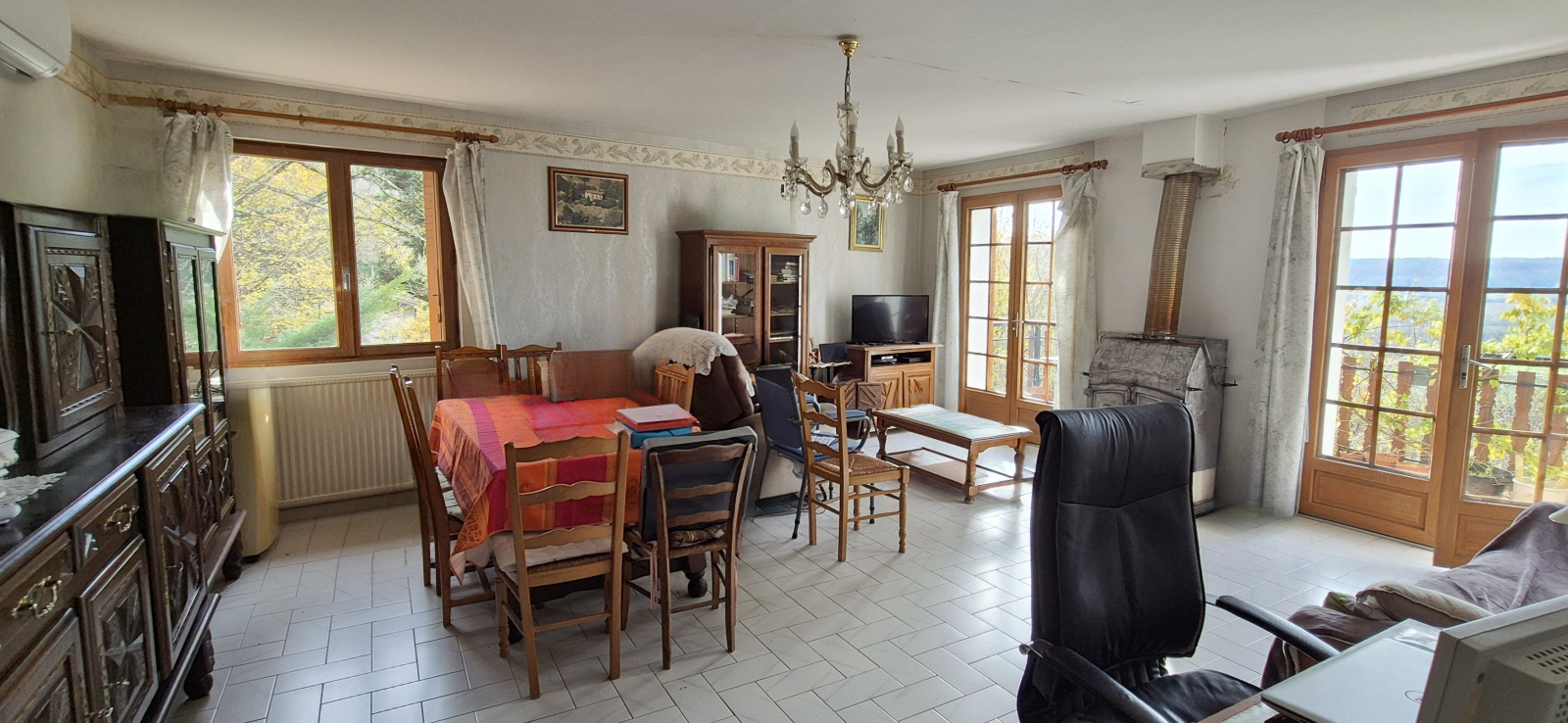 La maison est composée : d'un salon séjour de 34 m2 attenant à une cuisine équipée de 11 m2, tous deux très luminieux, donnant sur le balcon exposé sud ouest, offrant une vue magnifique et très dégagée sur la campagne, d'une salle d'eau de 5 m2 , d'un toilette, de trois chambres (dont deux de belles tailles de 12 et 14 m2 et d'une troisième de 10 m2, mais très mansardée).