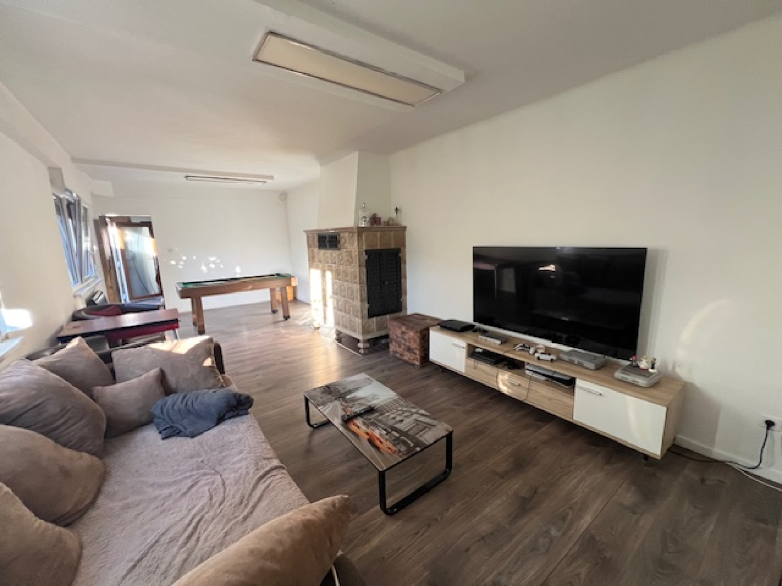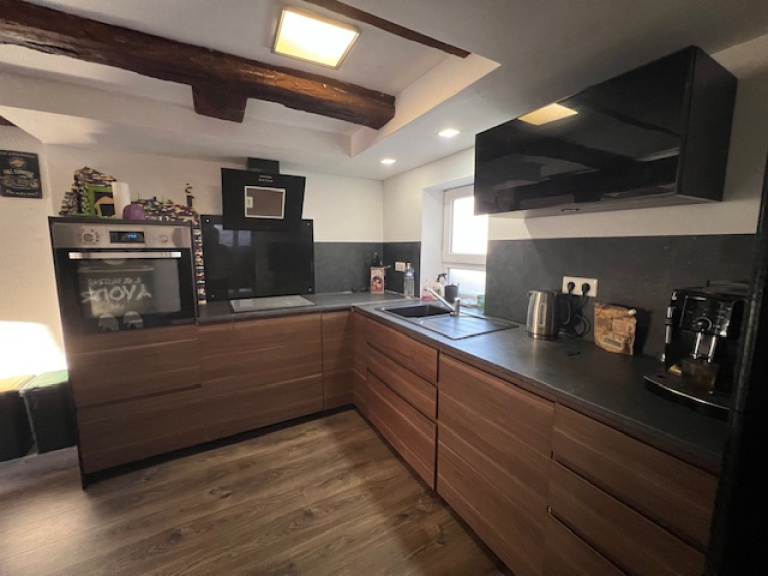 Le rez de chausée se compose d'une entrée, d'un grand séjour avec Kacheloffe, une cuisine équipée, une salle de bain avec WC et une chambre. L'étage comporte 3 chambres, un palier et un WC.