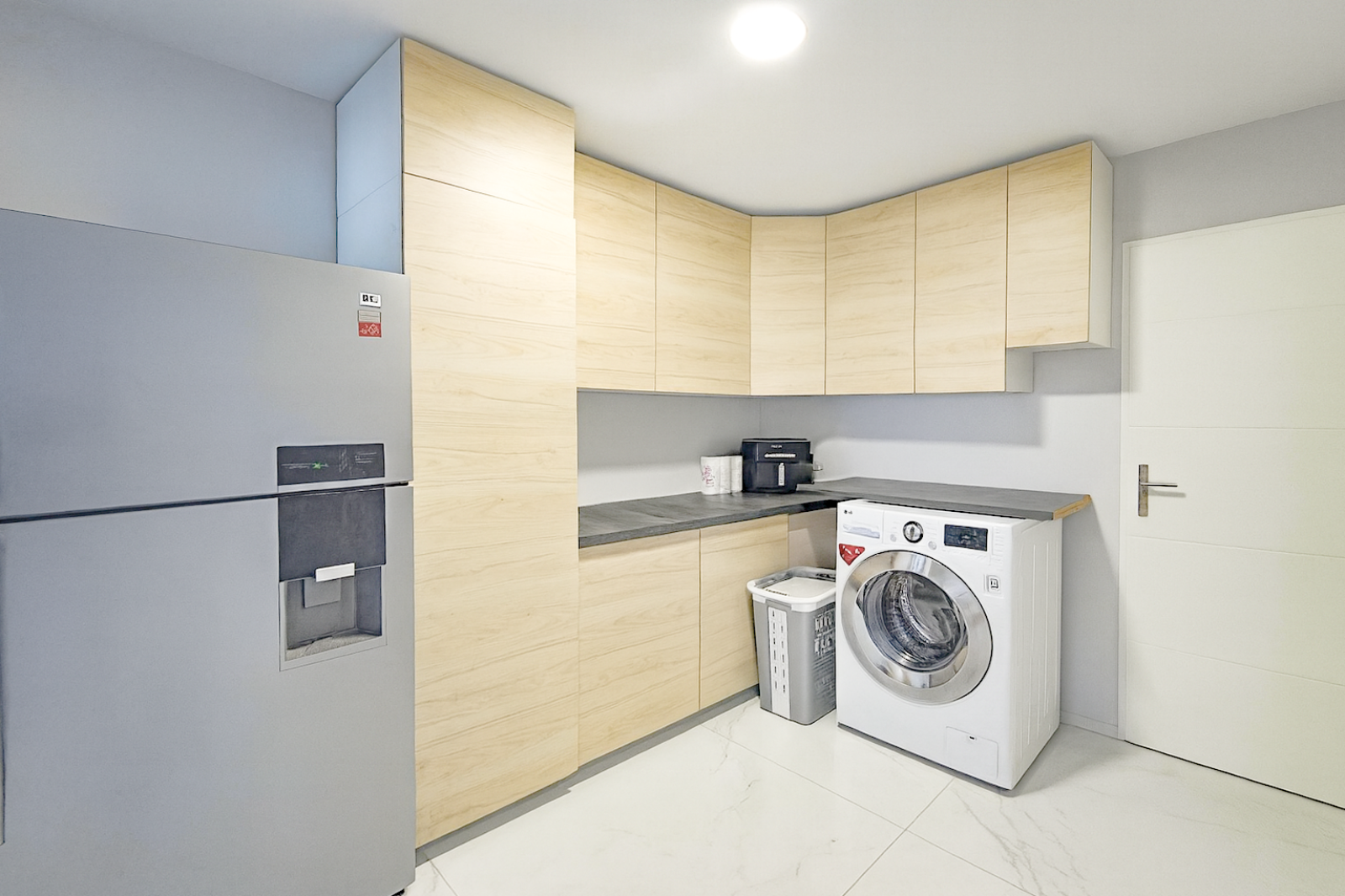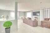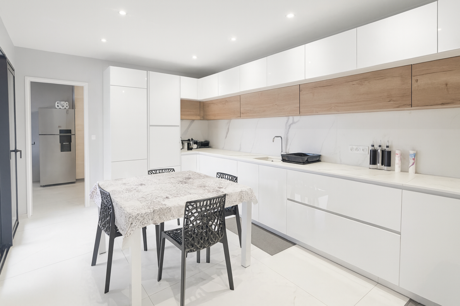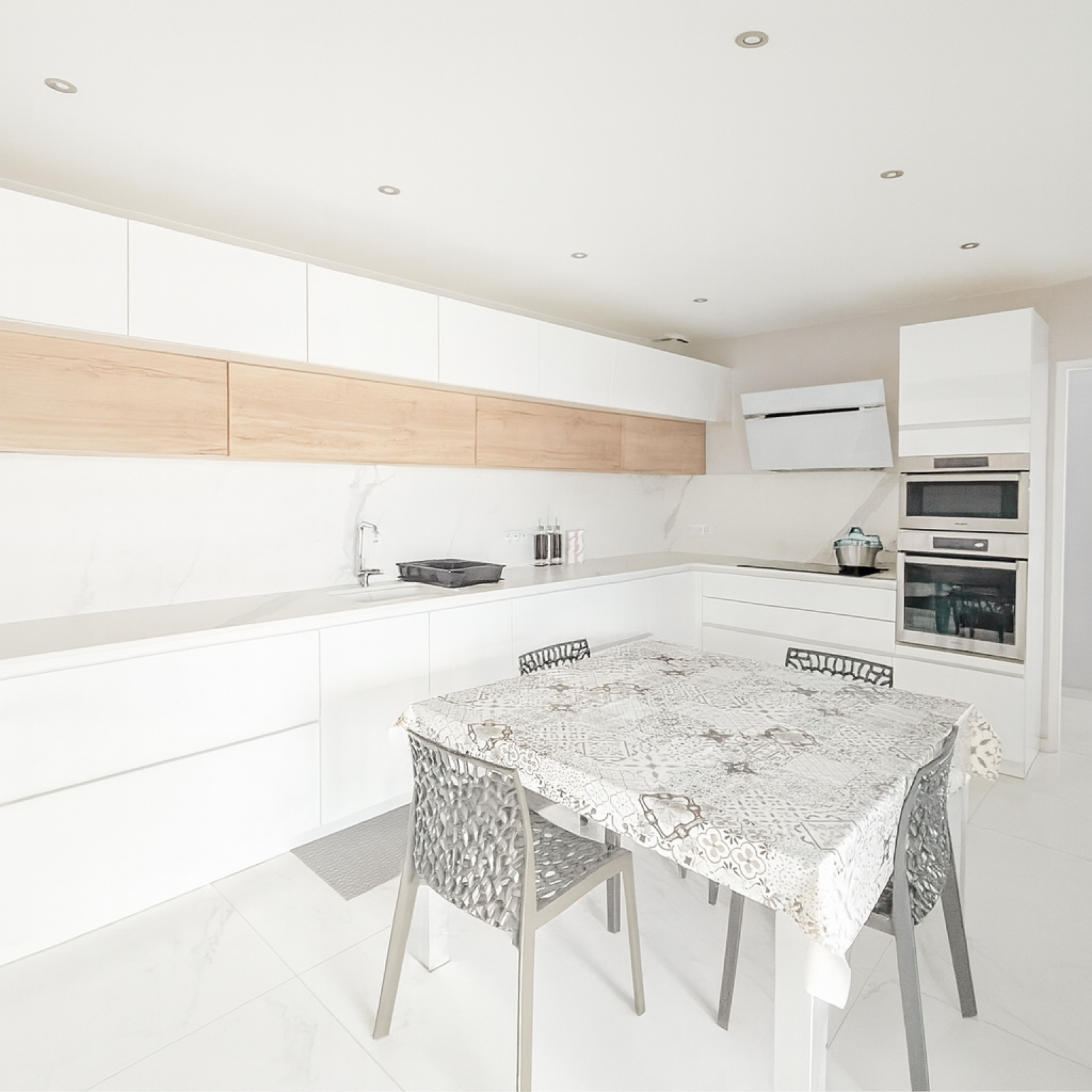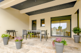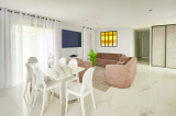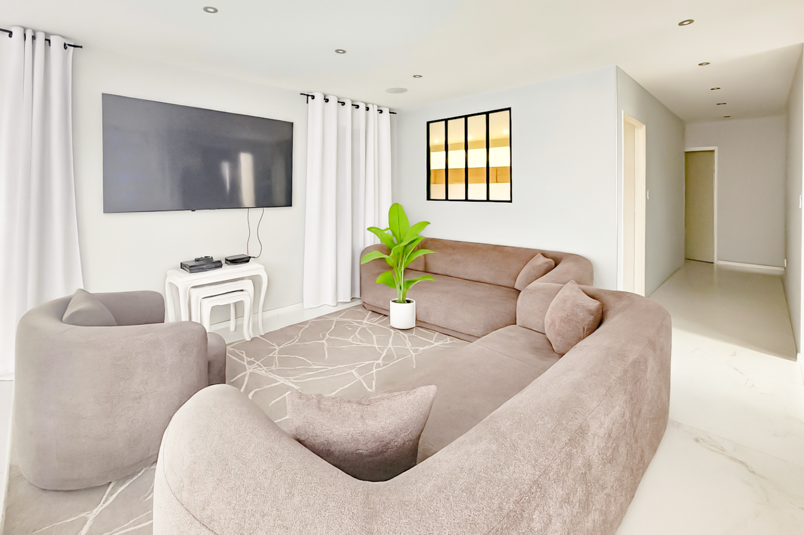 Une pièce à vivre majestueuse de 52m2 lumineuse et agréable à vivre + une cuisine de 18m2 entièrement équipée avec une baie vitrée s'ouvrant sur une terrasse abritée avec vues sur la piscine.
