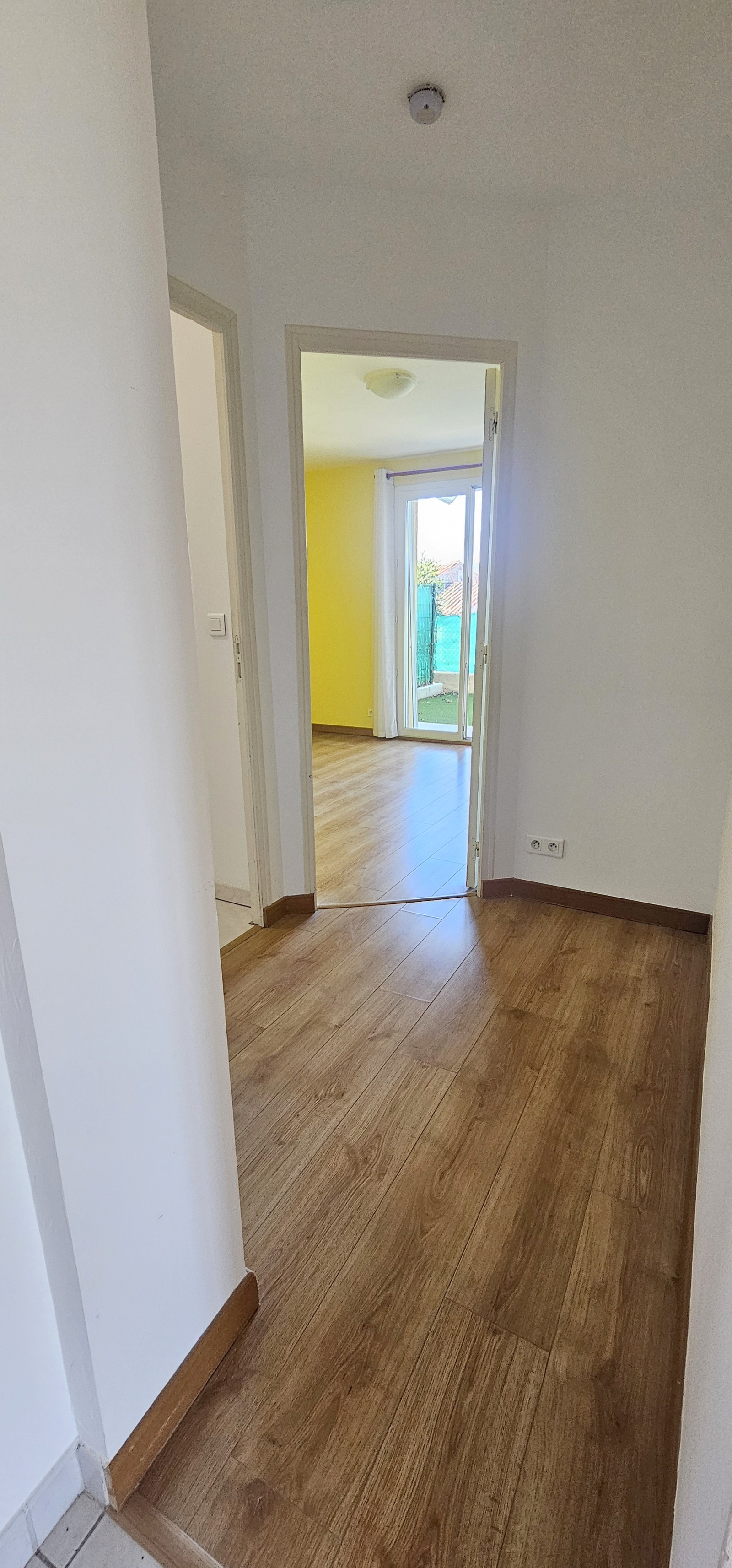 Entrée sur une belle pièce de vie de 31m² avec une cuisine entièrement aménagée ouvrant sur la terrasse par une porte vitrée à galandage, un dégagement dessert une salle d'eau avec WC indépendant, une buanderie , 2 chambres (12m² et 15 m²) dont une donne sur un jardinet côté sud.