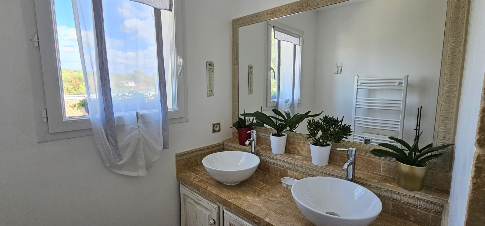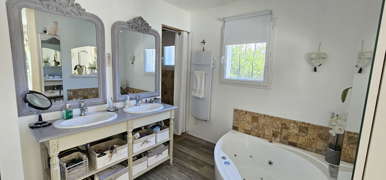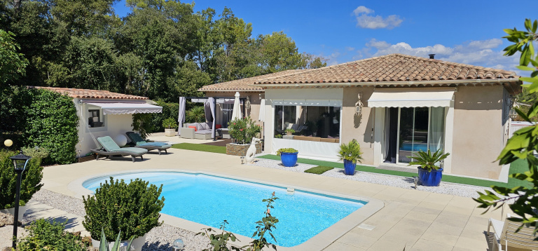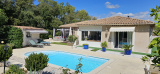 Les extérieurs: Piscie 8x3 à l'abri des regards, local technique, jardin aménagé et paysagé avec des essences méditerranéennes ne demnadant pas trop d'entretien.