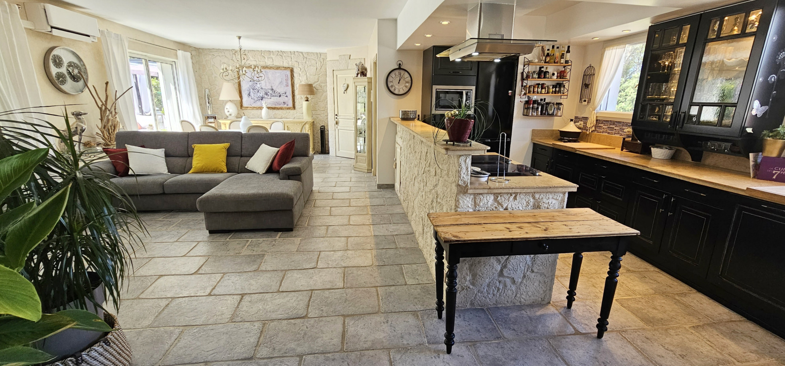 Climatisation réversible , poêle à bois style ancienne cuisinière, en trait d'union entre la cuisine et le séjou, volets électrique.