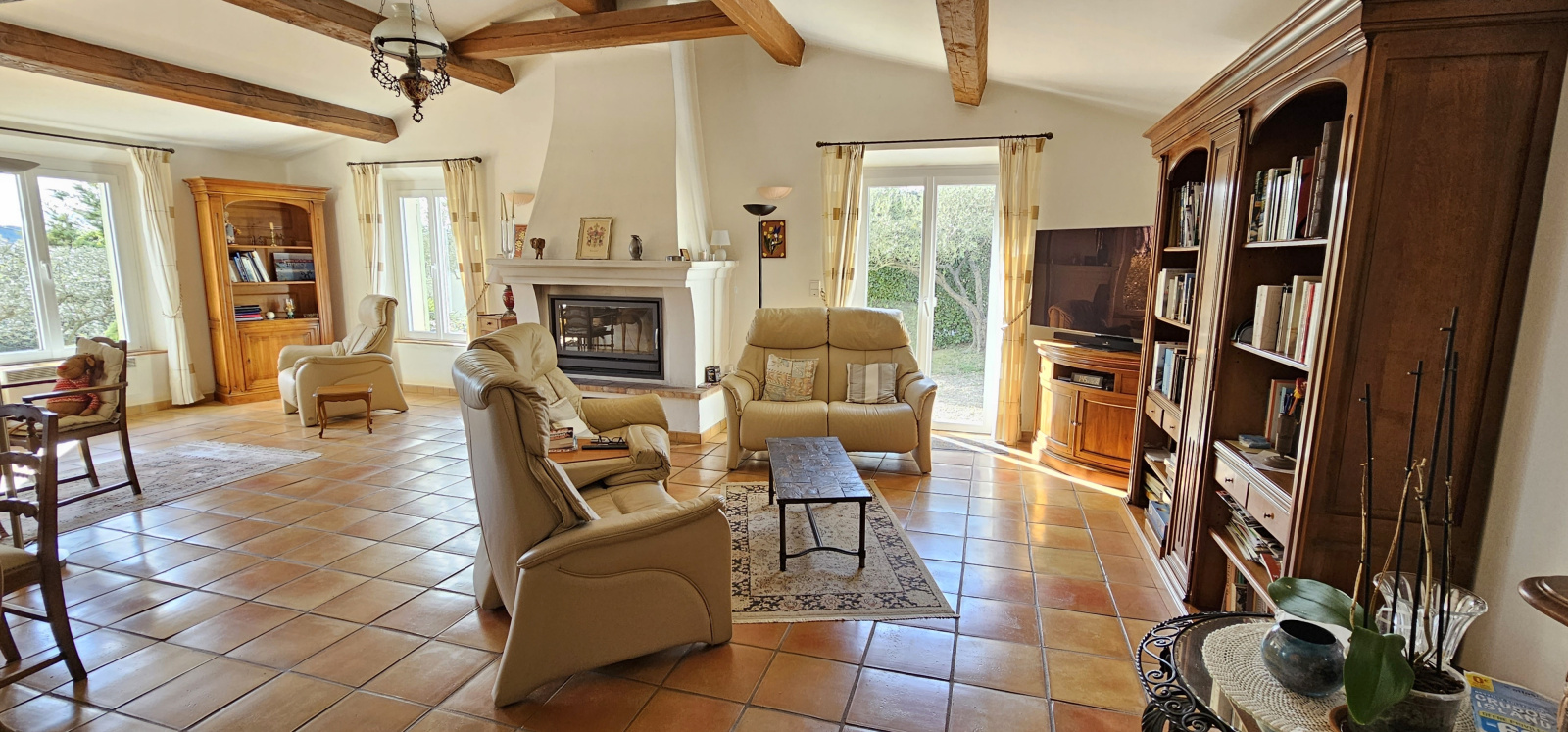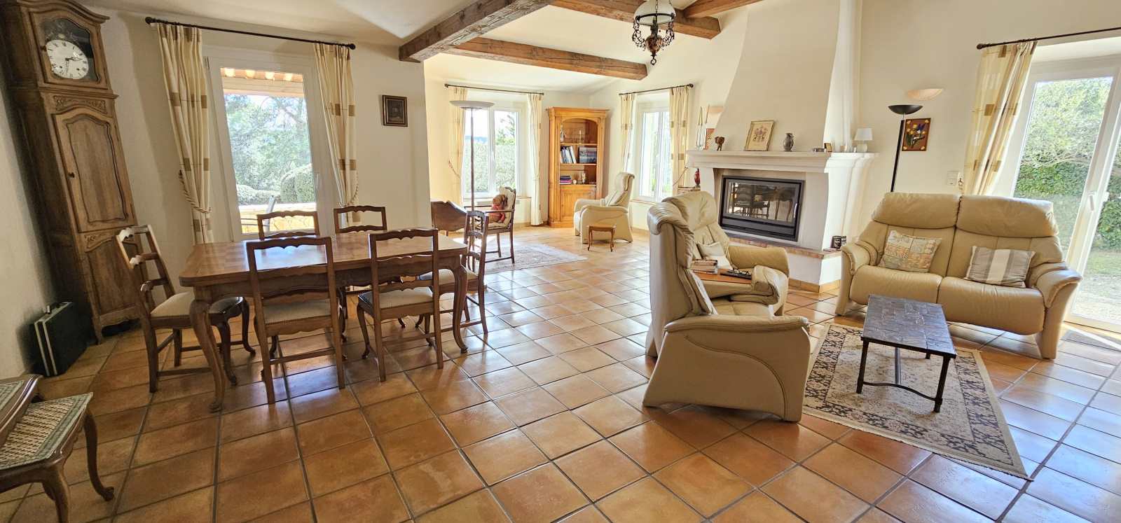 D'un Hall d'entrée avec toilettes invités, suivit d'un double séjour lumineux et chaleureux de 50m² avec cheminée foyer insert et une belle hauteur sous-plafond, une cuisine indépendante contemporaine, l'ensemble ouvrant sur une terrasse sud en partie couverte côté piscine, un dégagement dessert une salle d'eau, 2 chambres dont une suite avec salle d'eau et WC.