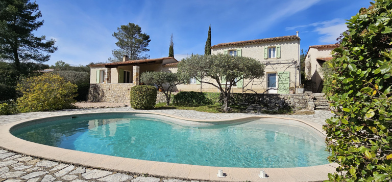 Les extérieurs : un bel espace autour d'une piscine forme libre à l'abri des regards, un double garage de 30m² avec une cave de même dimension, une terrasse couverte, le jardin est entièrement clos et le portail motorisé.