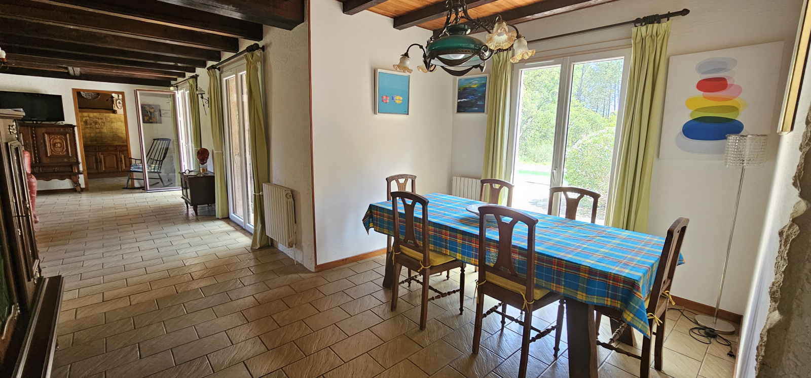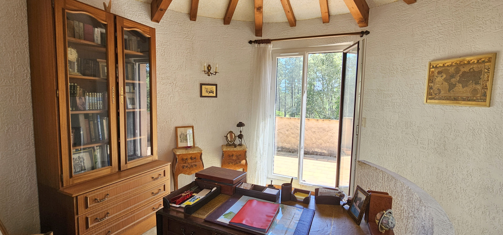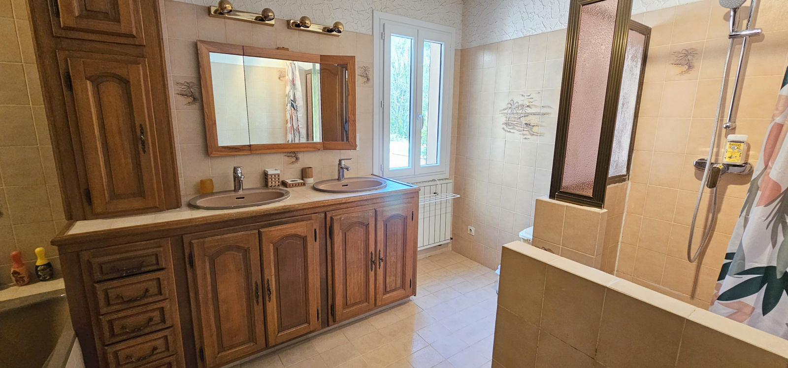 Dans un environnement résidentiel aéré au calme, sur un beau terrain naturellement arboré de 2900m² villa à 80% de plain-pied, construite en 1972 et agrandie en 1976 , composée au rez de chaussée: une entrée dans la tour, un salon salle à manger ouvrant sur une terrasse sud en partie couverte, une cuisine indépendante donnant sur la terrasse, un cellier buanderie, WC indépendant avec lave-mains, 3 chambres dont une suite avec salle d'eau+WC , une salle de bains ( baignoire et douche) , dégagement avec placards (dressing), et à l'étage de la tour un bureau ou une 4ème chambre avec une terrasse de 10m².