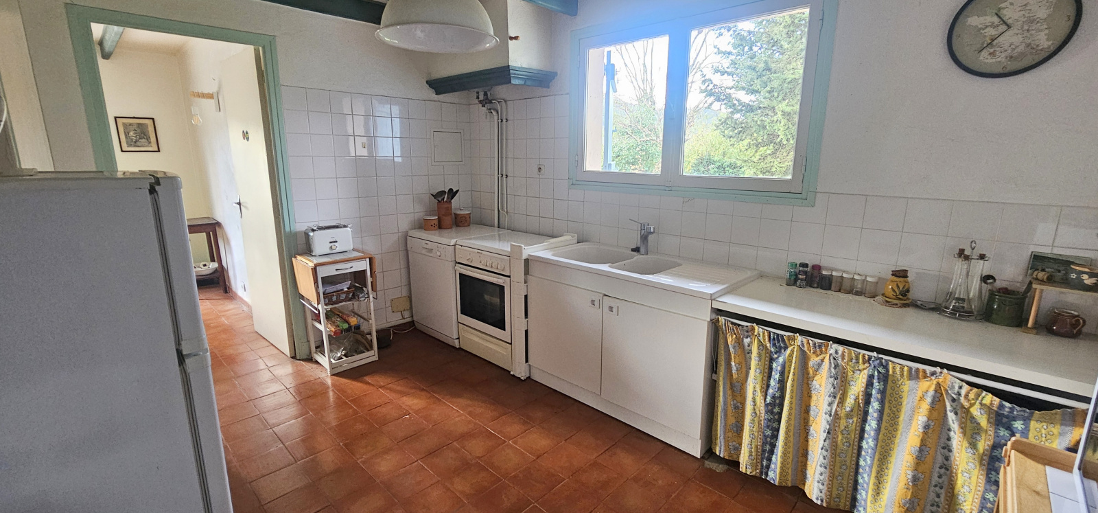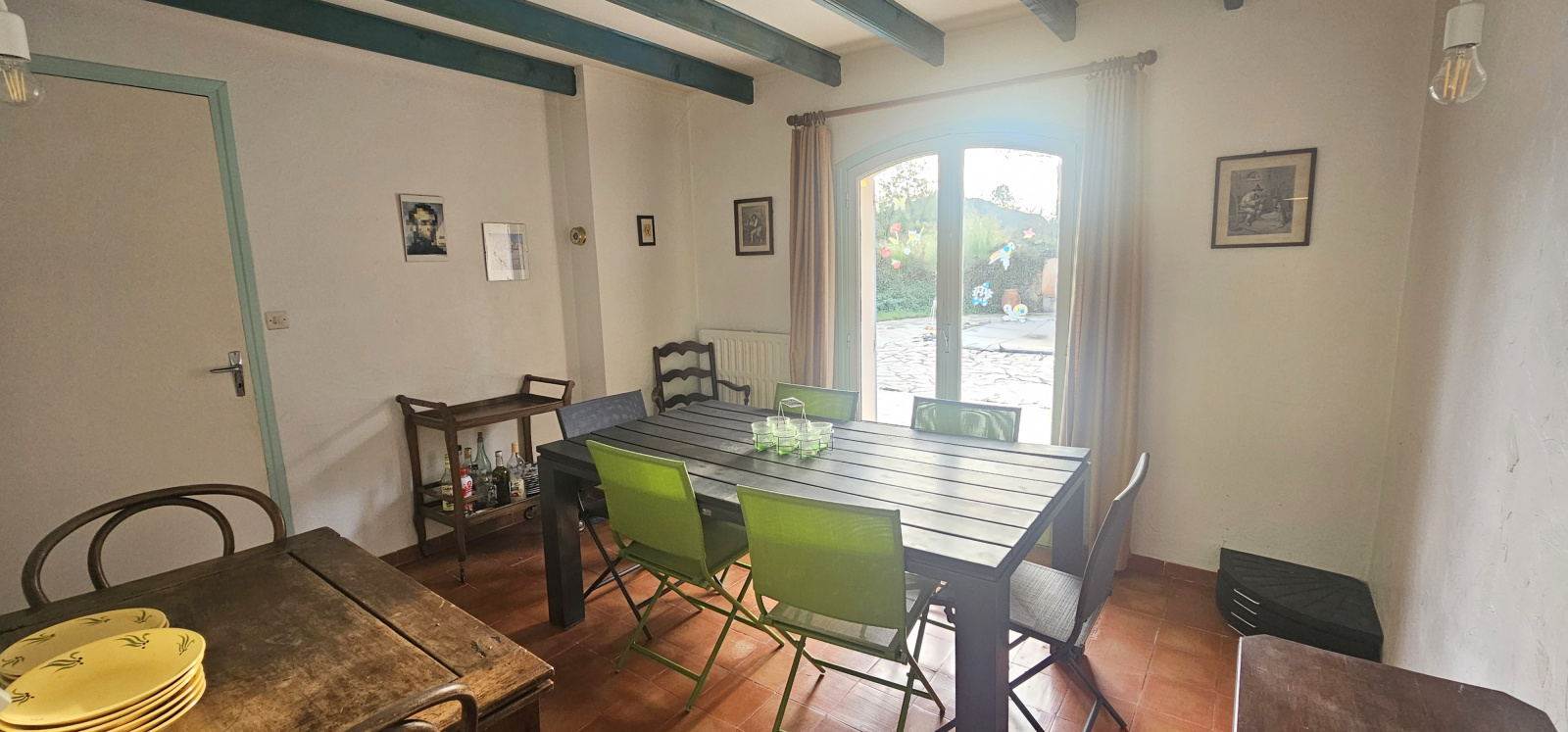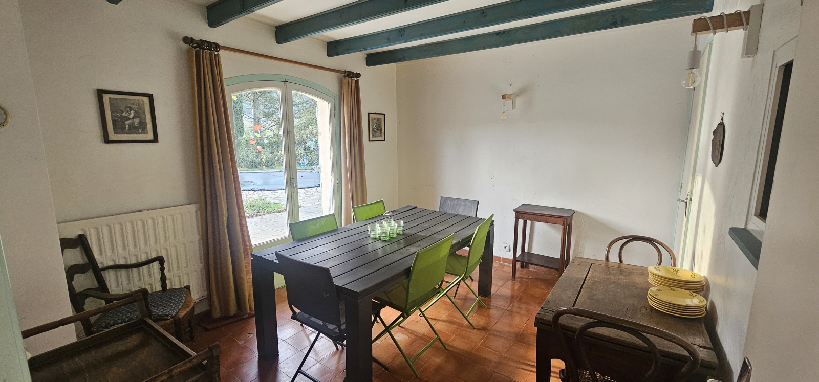 Au rez-de chaussée: Un porche et une terrasse couverte de 14m² , une entrée spacieuse, un séjour lumineux ouvrant sur une terrasse côté piscine, cheminée insert, salle à manger en trait d'union entre le salon et la cuisine indépendante de 12m², un dégagement dessert 2 chambres dont une de 18m², salle de bains et WC indépendant.
