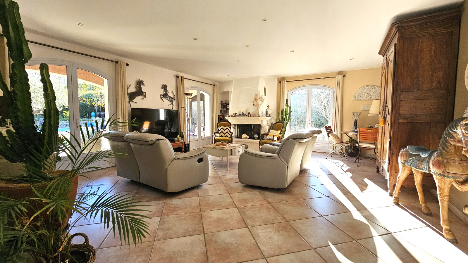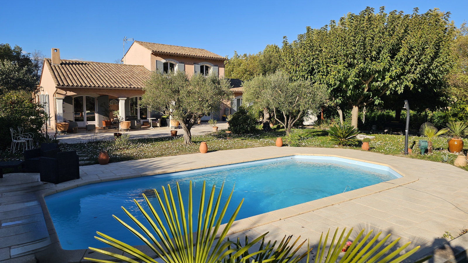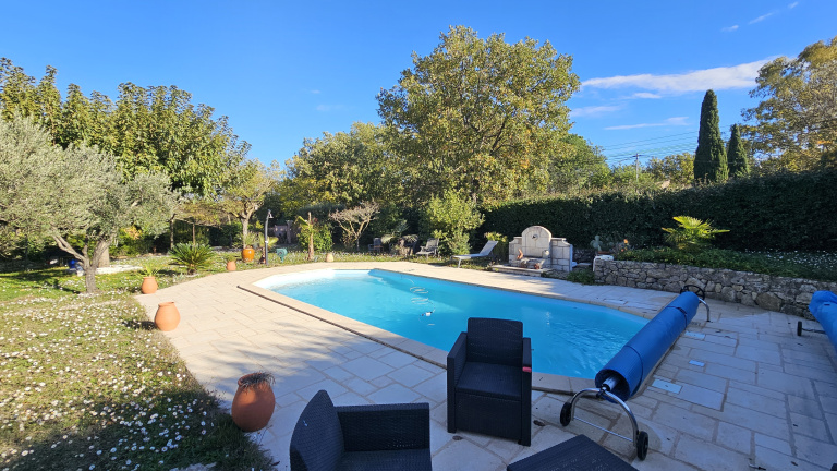 Extérieurs : Avec un accès direct à la villa, une buanderie /cuisine dans le garage de 36m², un ancien abri-voiture transformé en jardin d'hiver avec une verrière, indépendamment, un 2ème abri pouvant accueillir un camping-car et côté sud un espace piscine avec un bassin de 10x5, une jolie fontaine en pierre dans un jardin superbement arboré.