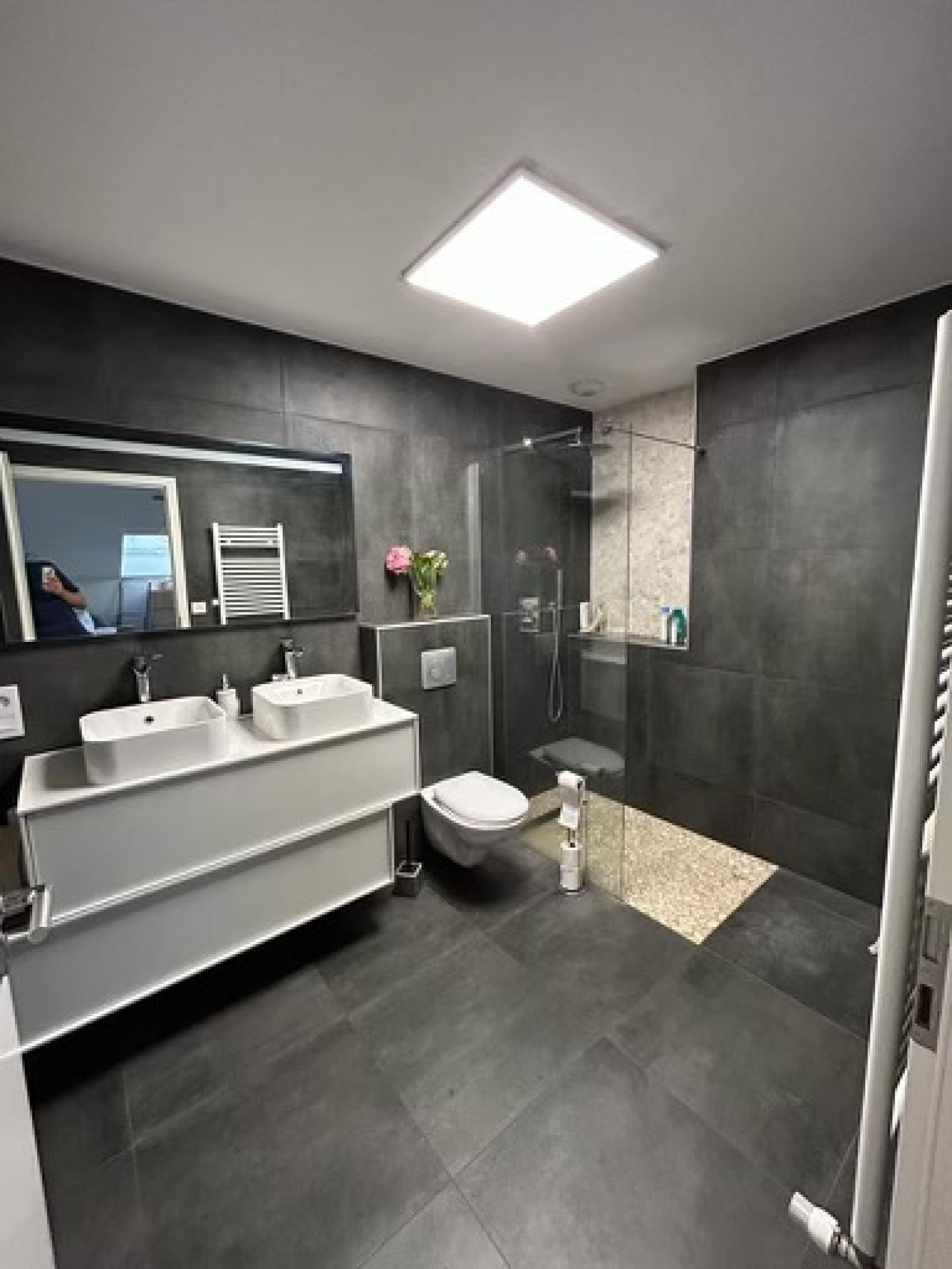Au 1 er étage deux chambres spacieuses, une mezzanine pouvant être facilement refermée pour faire une troisième chambre, une salle d'eau avec douche à l'italienne et double vasque.