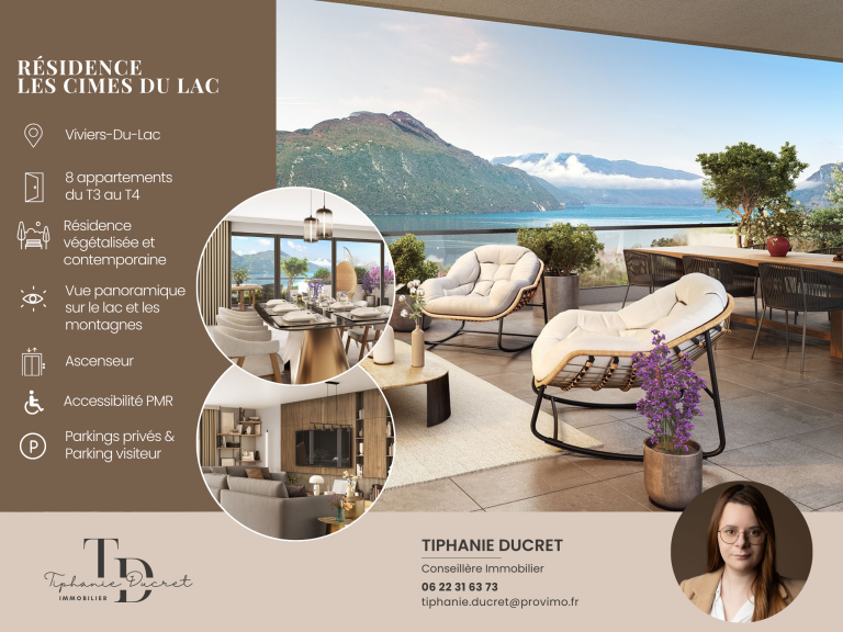 Cette réalisation confidentielle propose seulement 8 appartements du T3 au T4, conçus pour offrir volumes, luminosité et vues panoramiques sur le lac du Bourget.