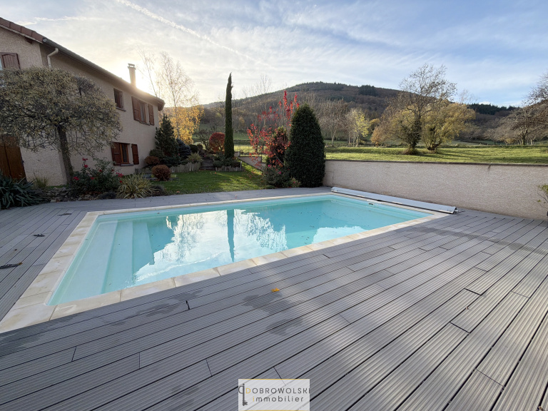 Lionel DOBROWOLSKI vous présente en exclusivité cette superbe propriété située sur les hauteurs de Condrieu au coeur du parc du pilat, dans un environnement naturel, calme et familial. Découvrez cette superbe maison composée d'une cuisine aménagée ouverte sur le séjour clair au plafond cathédral et à l'orientation idéale, le salon équipé d'une cheminée au foyer fermé, une large mezzanine à l'esprit cocooning, un WC indépendant, un bureau, 4 chambres dont 1 équipée d'un dressing et 1 au niveau inférieur équipée de sa SDE privative. Vous profiterez également d'un sous-sol complet disposant d'un garage double, d'une cave ainsi que d'un autre garage en annexe. Les extérieurs cloturés et végétalisés sont agrémentés d'une agréable piscine avec vue sur le pilat. La maison est équipée de menuiseries en bois double vitrage, d'un chauffage sol/radiateurs au fioul, d'une cheminée au foyer fermé, d'une isolation récente permettant une évaluation éfficace du DPE, celle-ci est également équipée de la fibre.