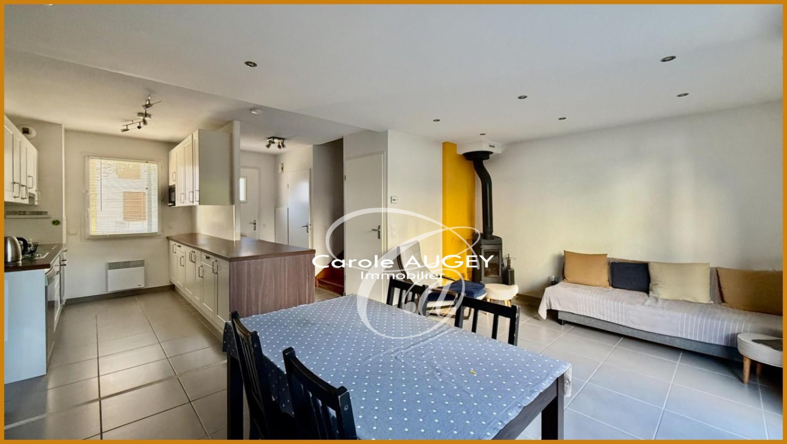 Suivez-moi et allons la visiter : la pièce principale, baignée de lumière grâce à sa large ouverture sur le jardin, s’anime autour d’un poêle à bois convivial. La cuisine ouverte, aménagée et pensée pour le quotidien, s’intègre harmonieusement à l’ensemble avec son comptoir qui se prolonge jusqu'à l'entrée, pertinent trait d'union de l'ensemble.