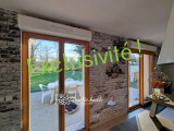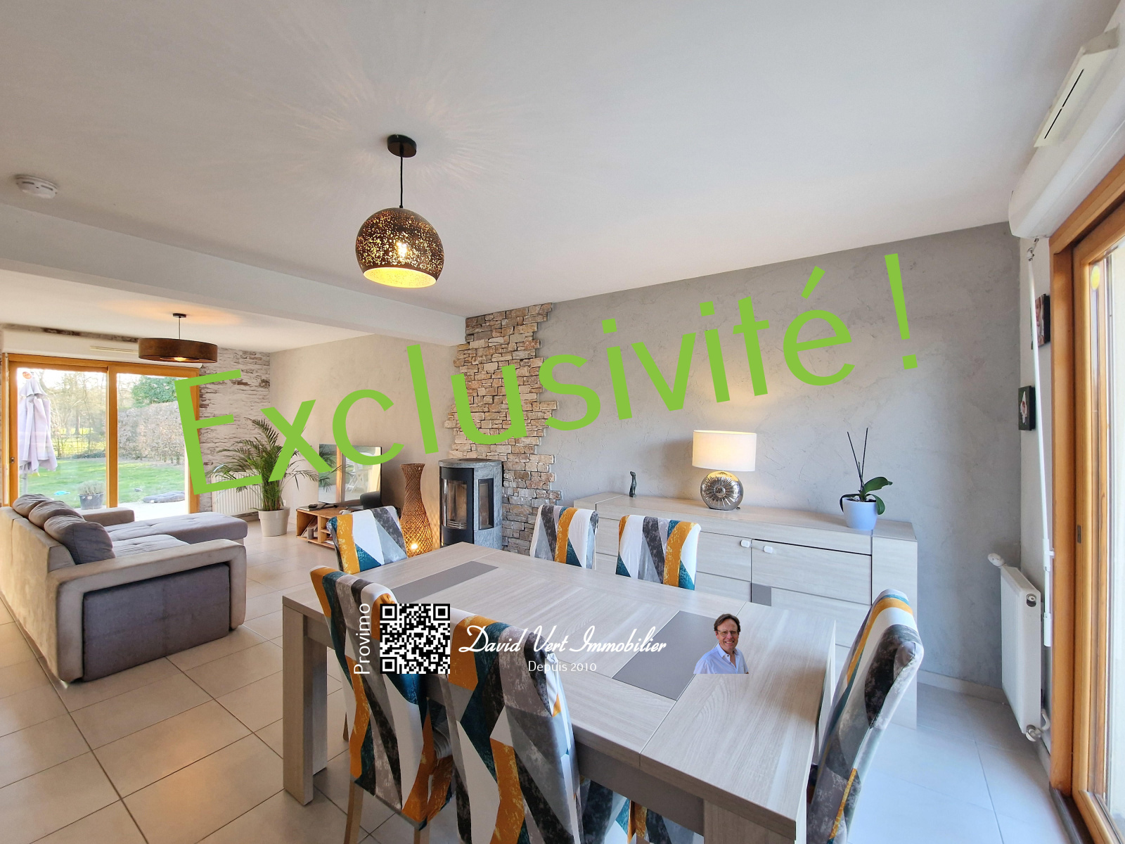 Dès l’entrée, la maison dévoile un vaste séjour lumineux, ouvert sur une cuisine conviviale, formant un espace de vie chaleureux pensé pour les moments en famille. Un poêle à bois vient renforcer cette ambiance cosy lors des soirées d’hiver. L’ensemble s’ouvre directement sur une belle terrasse exposée plein sud, idéale pour les repas d’été ou les moments de détente face au jardin et aux espaces verts environnants.
