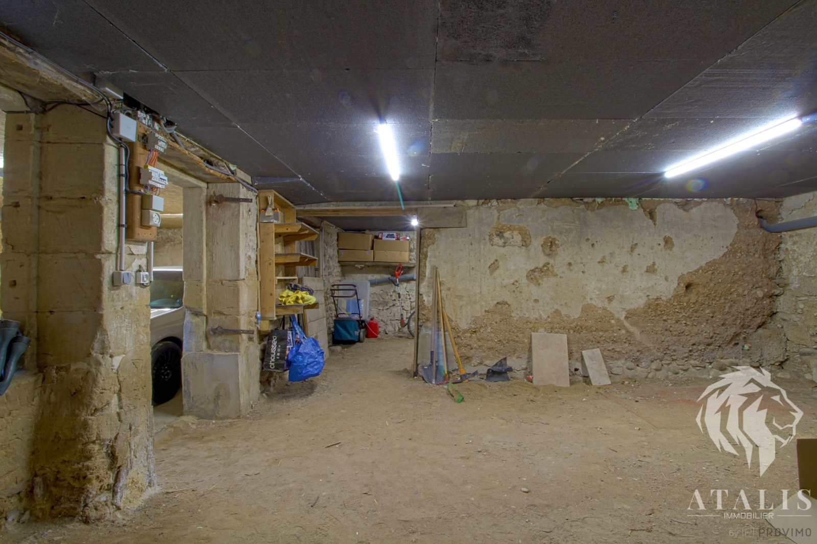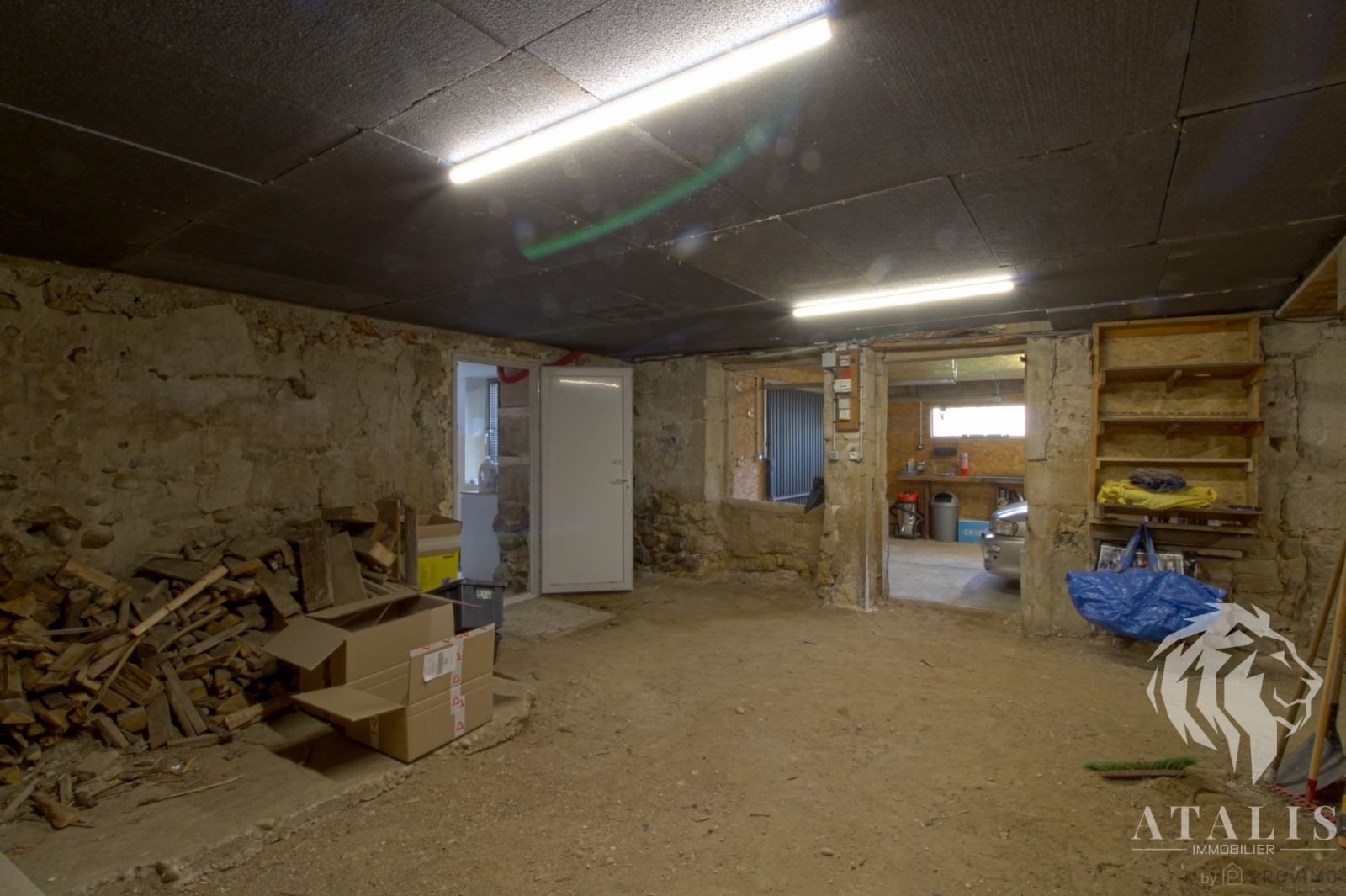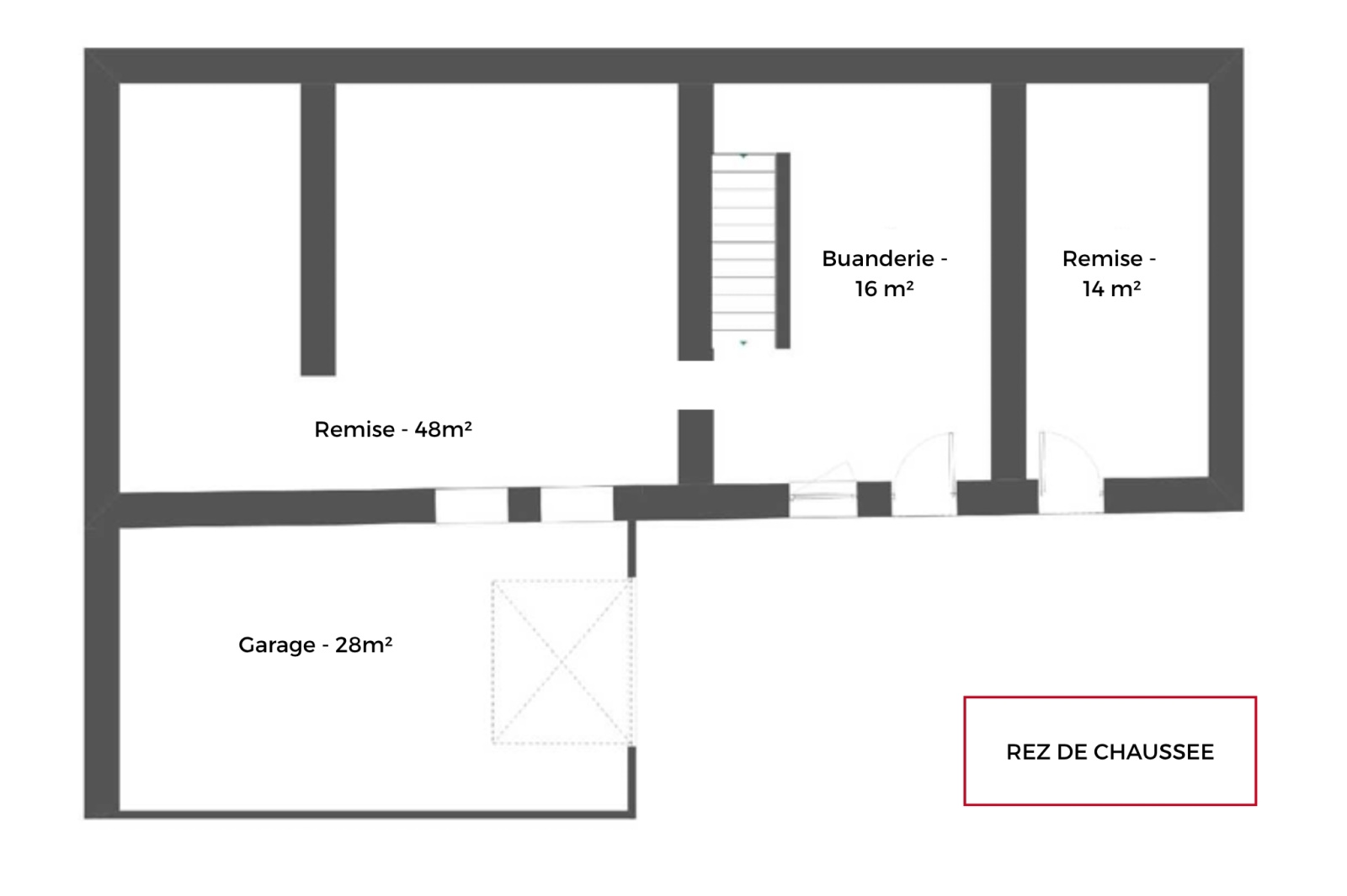 - Au rez de chaussée : un garage avec accès à 2 remises pour un total d'environ 73m², une remise (cave) d'environ 14 m², une entrée / buanderie d'environ 16m². Une cour gravillonnée, un jardin et un accès à la terrasse.