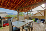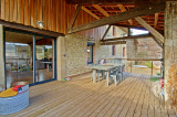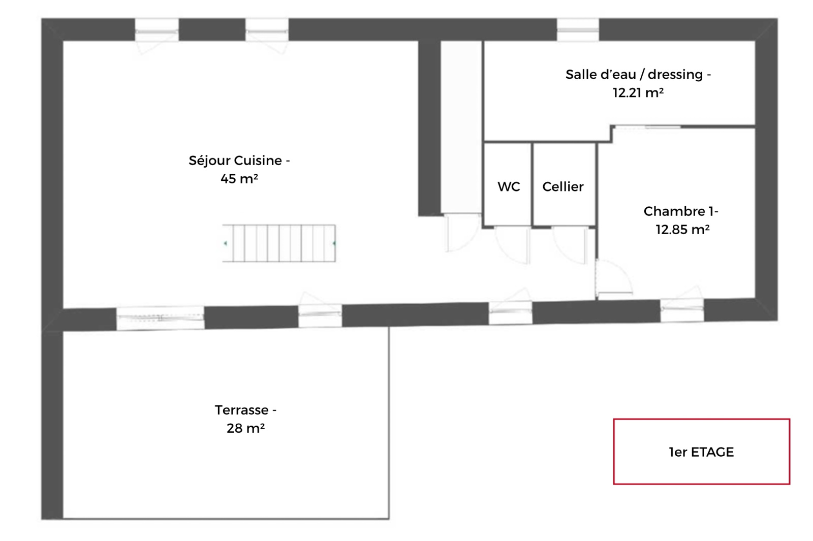 - Au 1er, accès depuis la terrasse ou par la buanderie : une terrasse bois de 28m² abritée qui donne accès à la cuisine / pièce de vie. Un dégagement, un WC indépendant, un cellier, une suite parentale d'environ 25m² composée d'une chambre, une salle d'eau et un grand dressing.