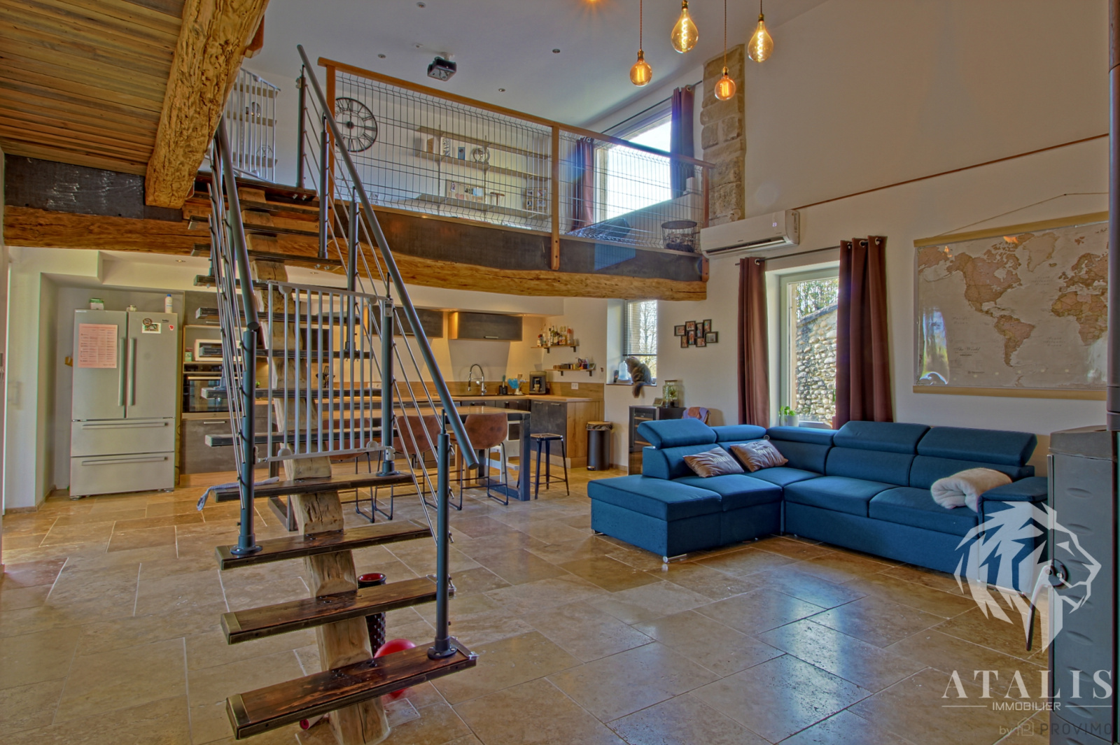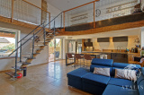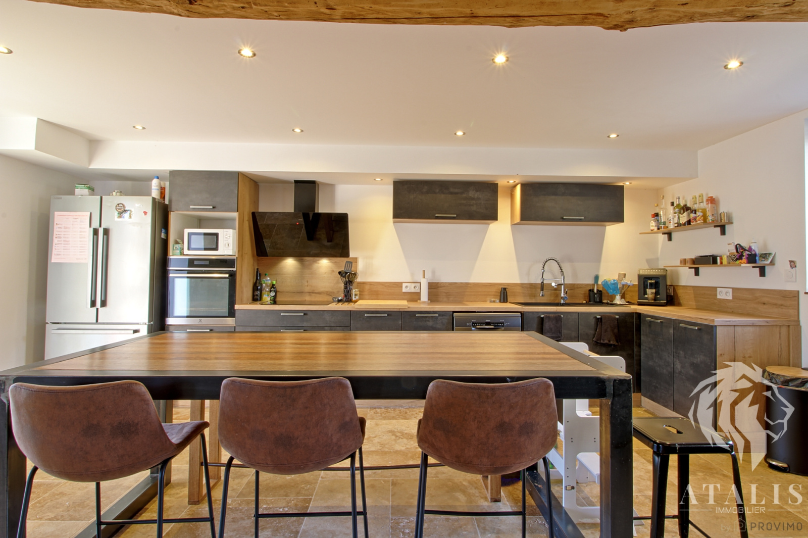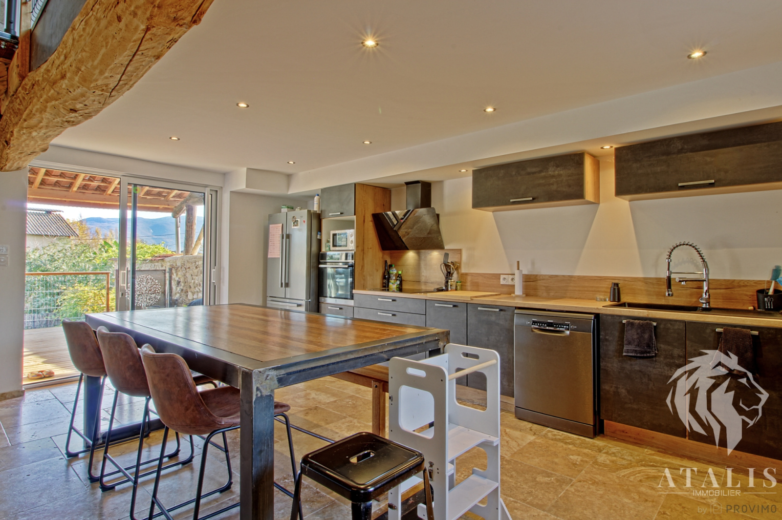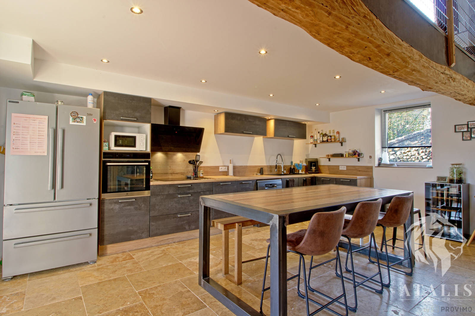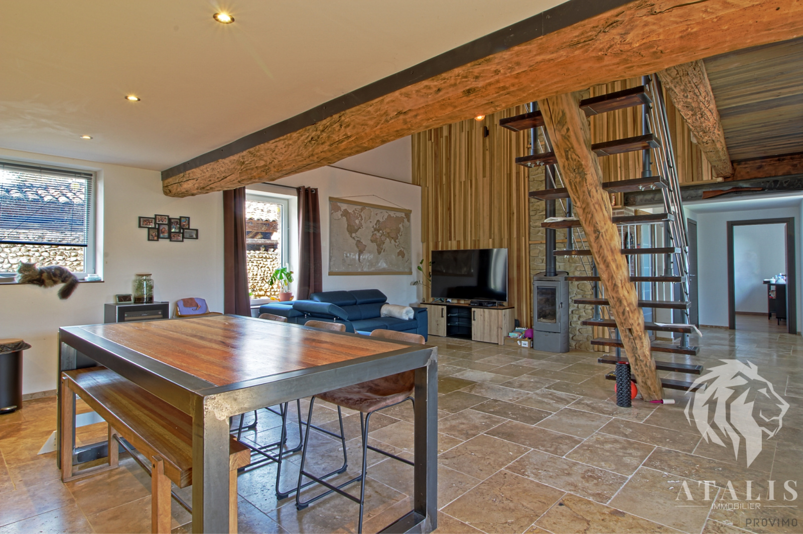 De la pierre, de la molasse, du bois et du fer, tels sont les éléments qui créent l'atmosphère unique de cette ancien bâtiment agricole transformé en habitation en 2020. Coup de coeur assuré avec les sols en travertin, la grande cuisine lumineuse ouverte sur le séjour avec son plafond cathédrale.