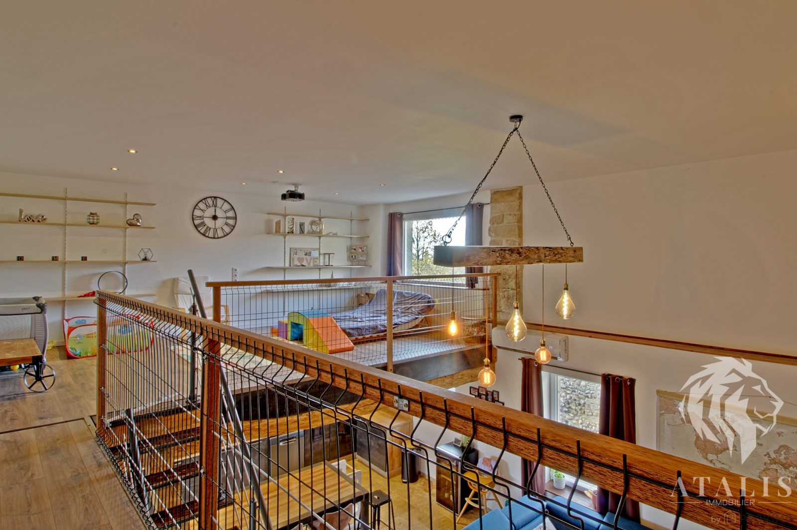 - Au 2nd, accès depuis la pièce de vie : une grande mezzanine (possibilité de 4 ème chambre), un dégagement, un WC indépendant, une salle de bains et 2 chambres.