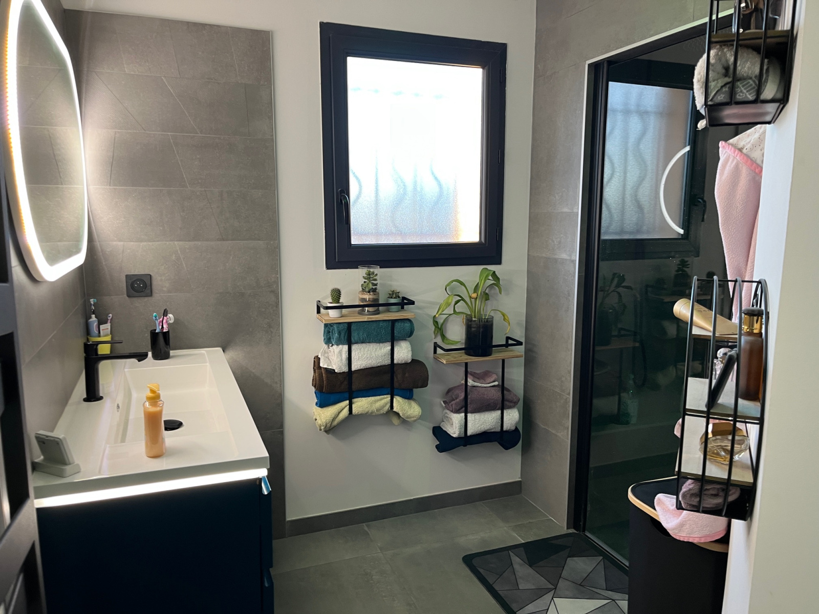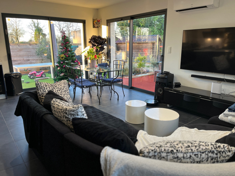 chauffage climatisation pack réversible, ballon thermodynamique,,...cette maison est composée d'un grand séjour-salon, cuisne ouverte équpée Cuisinella avec ilôt central de 42 M2, 3 chambres de 12, 10 et 10 M2, une belle salle d'eau moderne sur mesure. WC, dégagemet, garage de 28 M2. Extérieurs cosy et aménagés. Terrain clos de 476 m2.