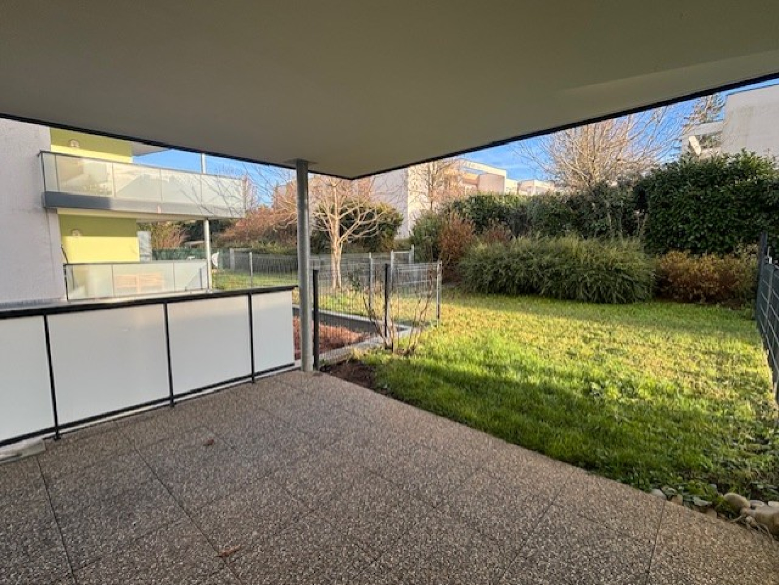 Une entrée avec rangement, une pièce de vie de 27.88 m2 composée d'une partie cuisine semi-équipée et d'un espace salon-séjour donnant accès sur une terrasse couverte de 12 m2 et d'un accès direct dans la partie engazonnée de 75 m2, deux chambres de 11.04 et 11.83 m2, une salle d'eau de 4.39 m2 avec grande douche à l'italienne et meuble vasque, un toilette séparé.