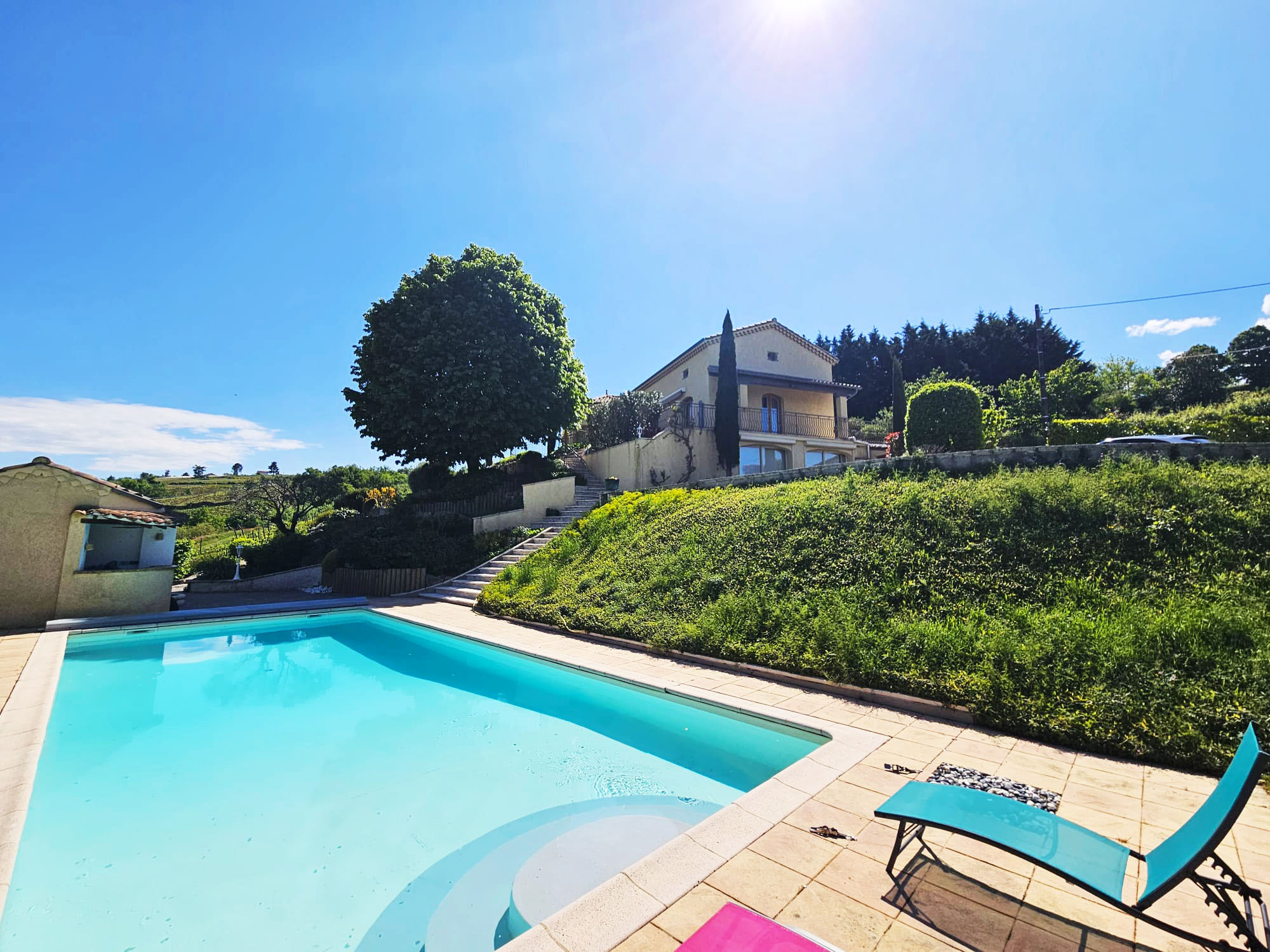 Sur les hauteurs, à 900 mètres du centre, des commerces et des moyens de transports, dans un environnement calme avec vue sur les monts d'or, belle maison traditionnelle (1975) parfaitement entretenue sur sous-sol, spacieuse, 200 M² habitable au total avec un grand séjour salon fermé de 41 M², 4 chambres de bonne dimension (2 à chaque niveaux), cuisine indépendante. SDB avec baignoire balneo...au sous sol une buanderie, 1 une grande pièce type salle de jeux avec son coin bar, coin atelier, cave.